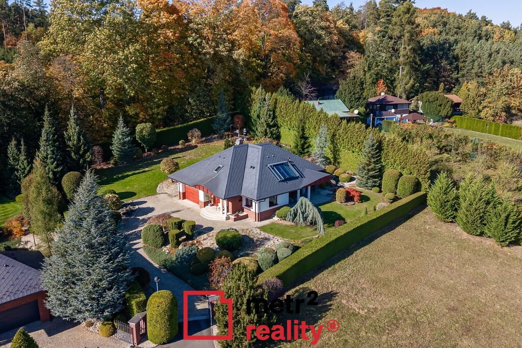 Jedinečná stavba zasazená do okrasné zahrady na okraji lesa – světlé interiéry, velkorysá dispozice a výhled, který vás každý den potěší. Originální dům s kruhovým schodištěm, velkým posuvným oknem v ložnici a přímým propojením interiéru se zahradou a okolní přírodou.