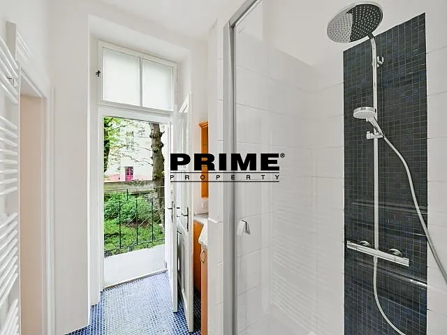 Zrekonstruovaný, 2 ložnicový, nezařízený mezonetový byt se 2 koupelnami k pronájmu, 3+kk, 118m2, s malým balkonem a s možností pronájmu garáže, situovaný v 1. patře a přízemí zrekonstruovaného secesního bytového domu s výtahem (obě ložnice směřují do klidného vnitrobloku).