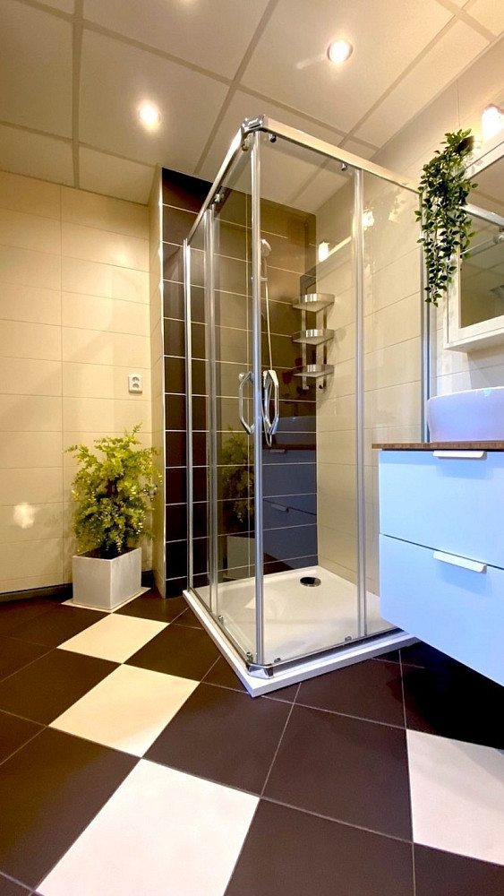 V bytě je instalováno teplovodní podlahové vytápění, které zajišťuje rovnoměrné teplo po celé ploše. Kuchyňská linka v kombinaci bílé, dřeva a chromu je plně vybavena spotřebiči – vestavnou myčkou, elektrickým sporákem s troubou, digestoří a lednicí s mrazákem. Koupelna (7 m²) je laděna do přírodních odstínů a vybavena sprchovým koutem, umyvadlem se zrcadlem a přípravou pro pračku a sušičku. Obývací pokoj (17 m²) působí vzdušně a nabízí pohled do zeleně.