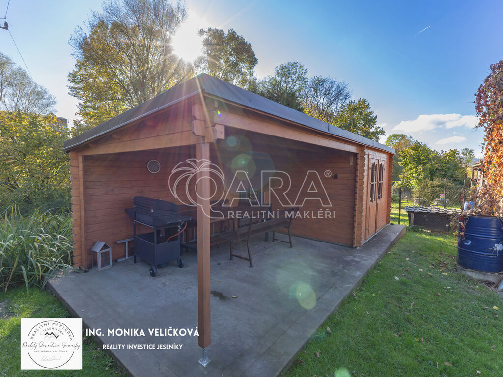 K bytu náleží samostatná zděná garáž, venkovní parkovací místo a oplocená zahrada o výměře 417 m². Na pozemku se nachází zahradní chatka, pergola s posezením a zahradní domek pro uložení sezónních věcí a nářadí. Zahrada nabízí dostatek prostoru pro volnočasové aktivity, zahradničení, dětské hry nebo klidné posezení během letních měsíců.