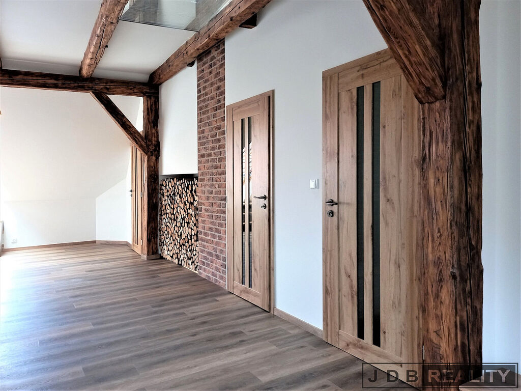 Nabízíme pronájem velice pěkného, celkově zrekonstruovaného a částečně zařízeného bytu o celkové velikosti 127m², který se nachází nedaleko Mírového náměstí v Litoměřicích. Klimatizovaný byt o dispozici 3+kk je situován v podkroví třípodlažního domu v centru města. Do bytu se dostanete po schodišti, dále do vstupní chodby a následně do velkého obývacího pokoje s plně vybaveným kuchyňským koutem, pracovním ostrůvkem a jídelním koutem. Vedle kuchyňské linky je samostatná spíž. Z centrálního obývacího pokoje kde je umístěn krb je vstup do dalších dvou pokojů a do koupelny. Koupelna je vybavena vanou a sprchovým koutem, umyvadlem, pračkou a sušičkou a je zde vstup na samostatné wc. V koupelně je dále umístěn nový plynový kotel, kterým je zajištěno vytápění a ohřev vody, v celém bytě jsou nová okna a kvalitní vinylové podlahy. K bytu dále náleží sklad, velká půda a sklep. Zajímavostí bytu jsou dvě velká výklopná okna s vyhlídkou. Parkování je možno přímo před domem.