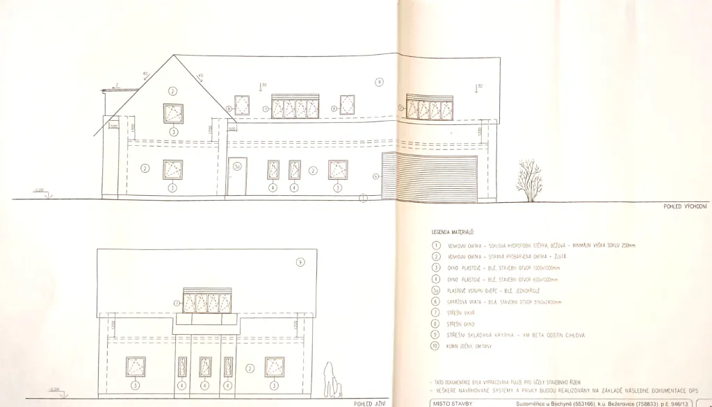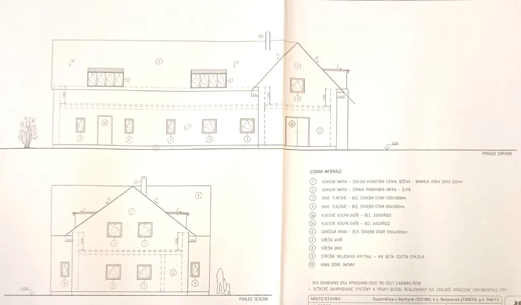 Obvodové zdivo je ytong 45 cm, vnitřní nosné zdivo ytong 25. Stropy jsou z litého betonu s armaturou. Střešní krytina betonová KM Beta černé barvy. Okna a dveře jsou plastová, garážová vrata zásuvná.
