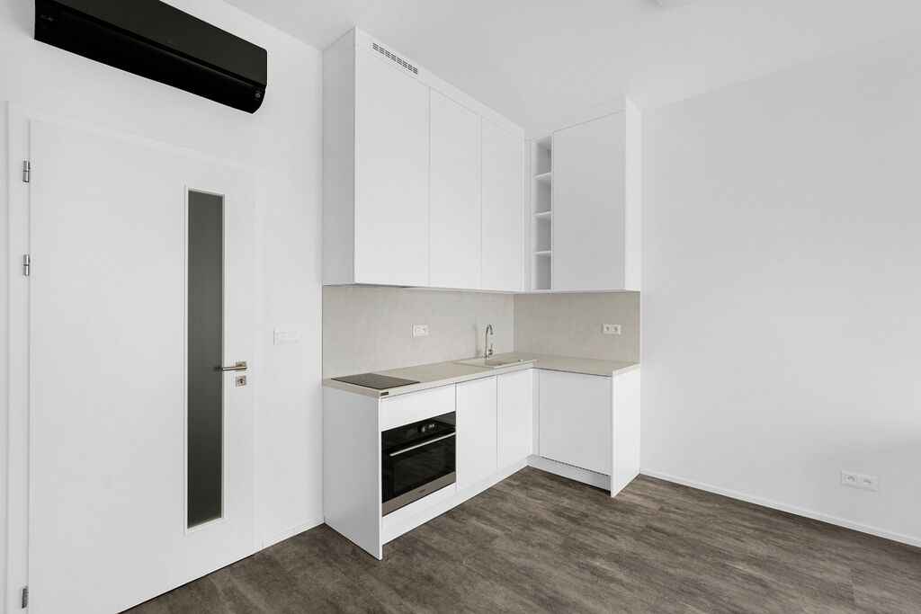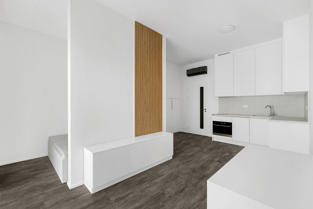 Nabízíme velmi prakticky řešený byt o dispozici 1+kk s dnes velmi oblíbeným odděleným prostorem na spaní a 10m² velkým balkonem, který poskytuje příjemný prostor pro relaxaci. Interiér jsme plně vybavili kvalitním nábytkem v podobě vestavěných skříní, postele s matrací, TV stolkem a jídelním stolem, a samozřejmě také kuchyní na míru se spotřebiči a dalším drobným nábytkem dle fotografií. V koupelně pak najdete praktickou pračku se sušičkou a nejednoho potěší oddělená toaleta. V dnešní době pak jistě oceníte i přítomnost klimatizace a elektricky ovládaných venkovních žaluzií.