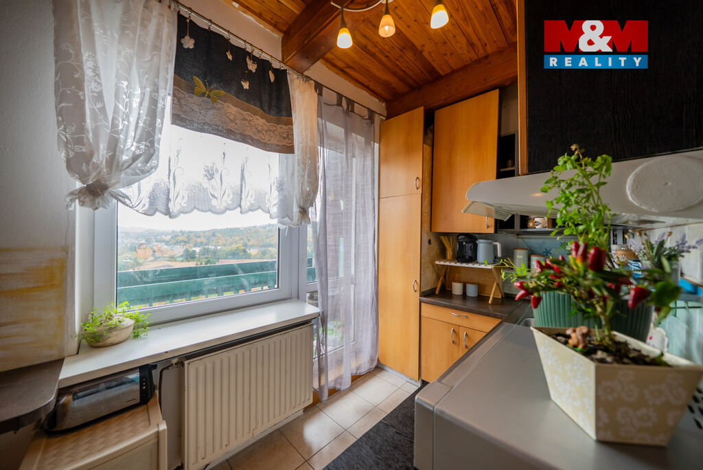 Nabízíme k prodeji mezonetový byt o dispozici 3+kk a celkové ploše 53 m². v pátém, posledním patře domu na ulici Kaštanová v Rosicích. Po vstupu vás přivítá menší předsíň, ze které se dostanete do koupelny se sprchovým koutem a samostatného WC. Kuchyň je částečně oddělená od obývacího pokoje, má přímý vstup na malý balkón, ten sice není velký, ale výhled z něj rozhodně ano. Díky orientaci na jihovýchod je byt krásně prosvětlený po celý den. Po schodech nahoru se dostanete do otevřeného prostoru, který lze jednoduše uzavřít a vytvořit tak další samostatný pokoj. Najdete tu také druhý pokoj, ideální jako ložnici či dětský pokoj.K bytu patří sklep a také komora přímo na patře, takže úložného prostoru je víc než dost.Parkování je zajištěno přímo u domu na veřejném parkovišti. Rosice jsou vyhledávanou lokalitou s výbornou dostupností do Brna a veškerou občanskou vybaveností. Pokud hledáte klidné místo k bydlení s výhledem, který vás jen tak neomrzí, tenhle byt si zaslouží vaši pozornost.