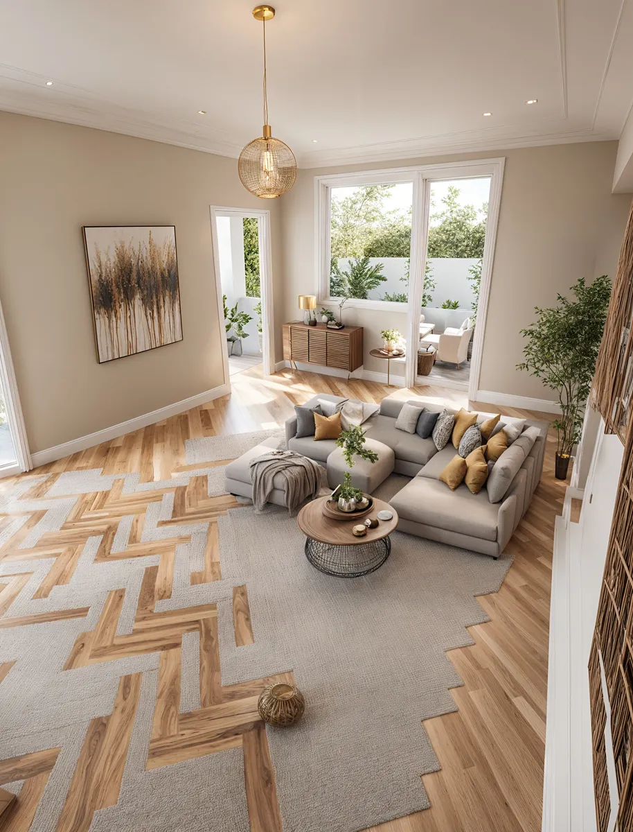 Světlý obývací pokoj s kvalitními parketami, které najdete i v obou ložnicích