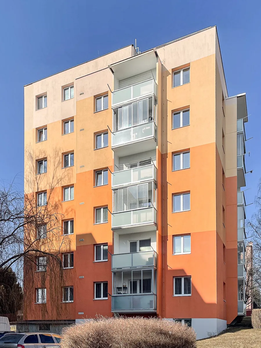 Modernizovaná budova: nová fasáda, plastová okna s dvojskly, nový výtah a 100% fungující SVJ