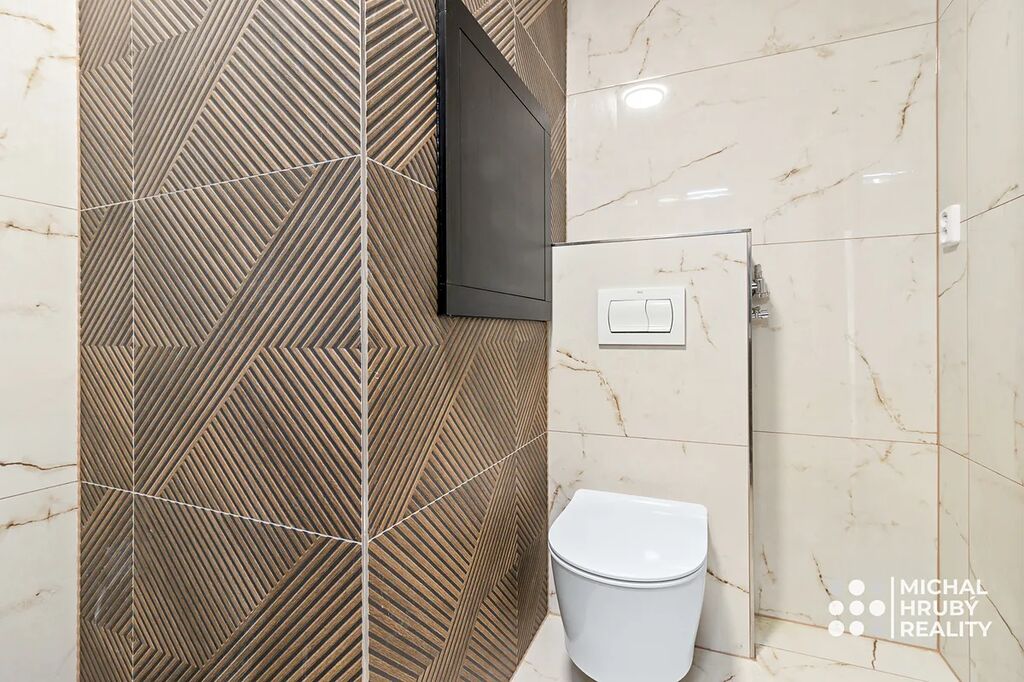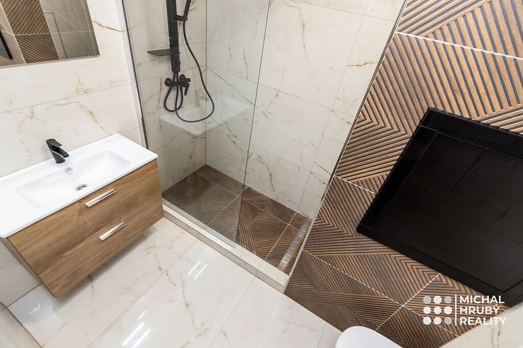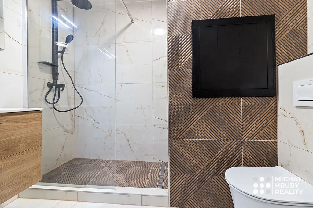 Nejvíce to jde vidět na moderně pojaté koupelně, kromě nadčasového designu, moderního sprchového koutu tady budete mít i vyhřívanou podlahu. Kuchyně je dělaná bytu na míru vč. značkových spotřebičů a trochu se hýbalo s příčkami, aby tady vznikl dobře využitelný prostor. Oba pokoje jsou neprůchozí s výhledem do zeleně.