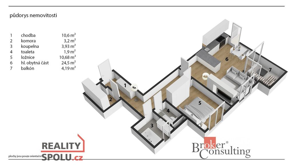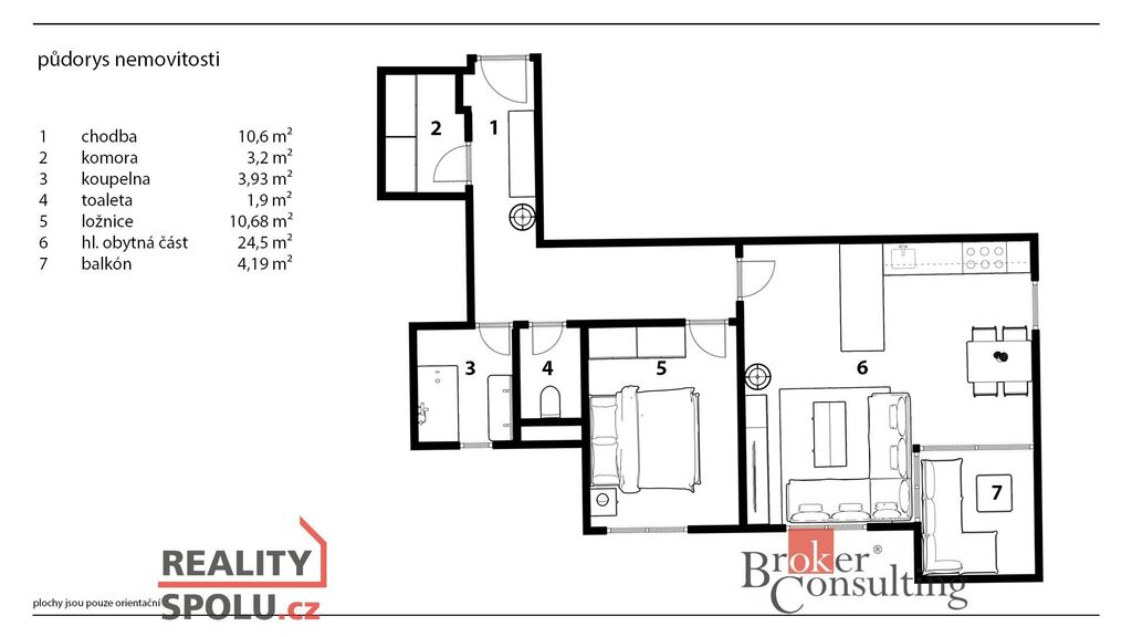 Dispozici tvoří prostorná vstupní chodba (10,6 m²), komora (3,2 m²), koupelna (3,93 m²), samostatné WC (1,9 m²), ložnice (10,68 m²) a hlavní obytná část s kuchyňským koutem (24,5 m²) a vstupem na balkon (4,19 m²).