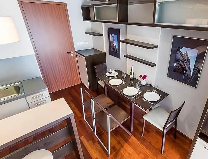 Byt je plně vybaven designovým nábytkem, komfortním dvoulůžkem typu king size, kuchyňskou linkou s kompletním vybavením (nádobí, příbory, kávovar atd.), televizí se satelitním příjmem a vysokorychlostním internetem, který je již zahrnut v ceně nájmu.