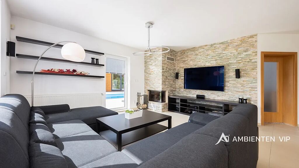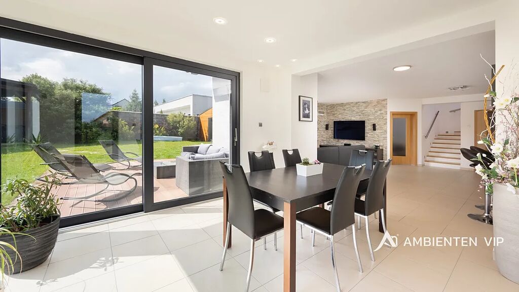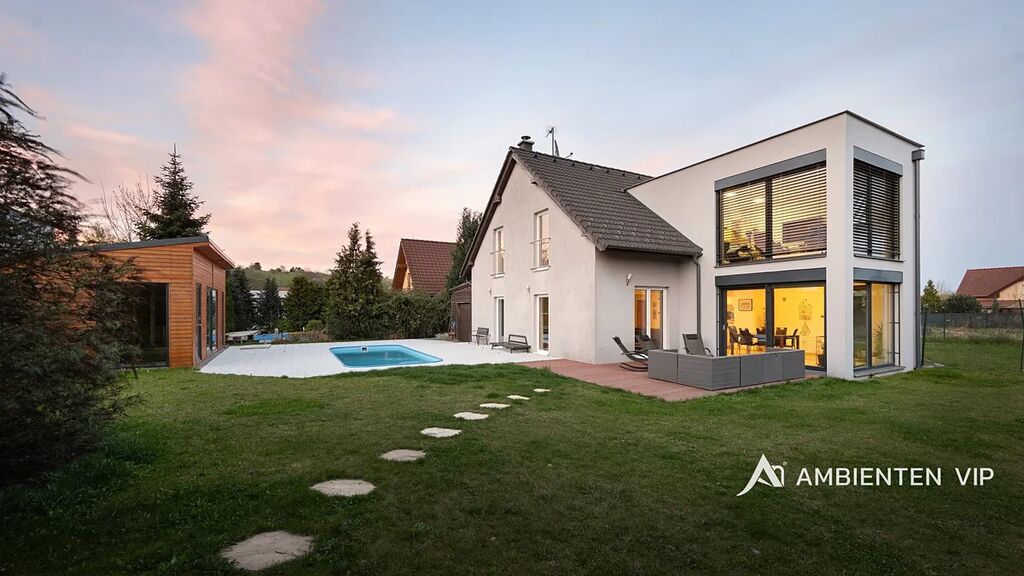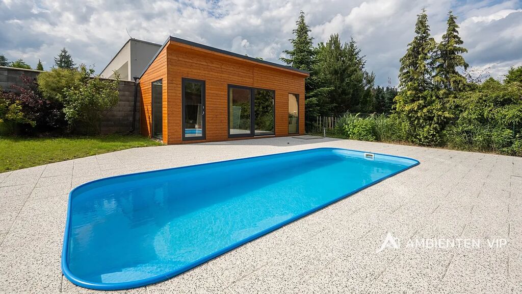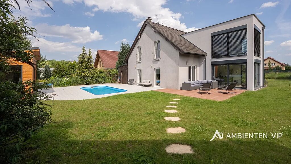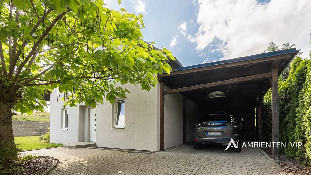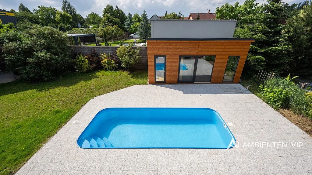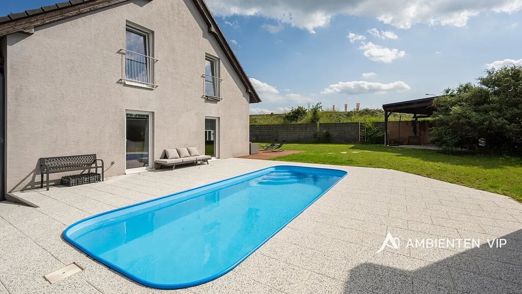 AMBIENTEN VIP si Vám dovoluje exkluzivně nabídnout prodej prostorného samostatně stojícího rodinného domu o dispozici 5+kk se zahradou, bazénem, zahradním domkem a s možností parkování až 6 vozů na vlastním pozemku v obci Popůvky. Celková užitná plochu domu činí 209,66 m² a plocha pozemku 1282 m².