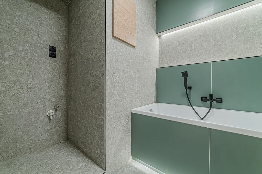 Koupelna je velkorysá a disponuje vanou, místem pro pračku a sušičku, což je jistě velkým přínosem pro moderní rodiny. V koupelně požité velkoformátové obklady 120x60. Toaleta oddělena.