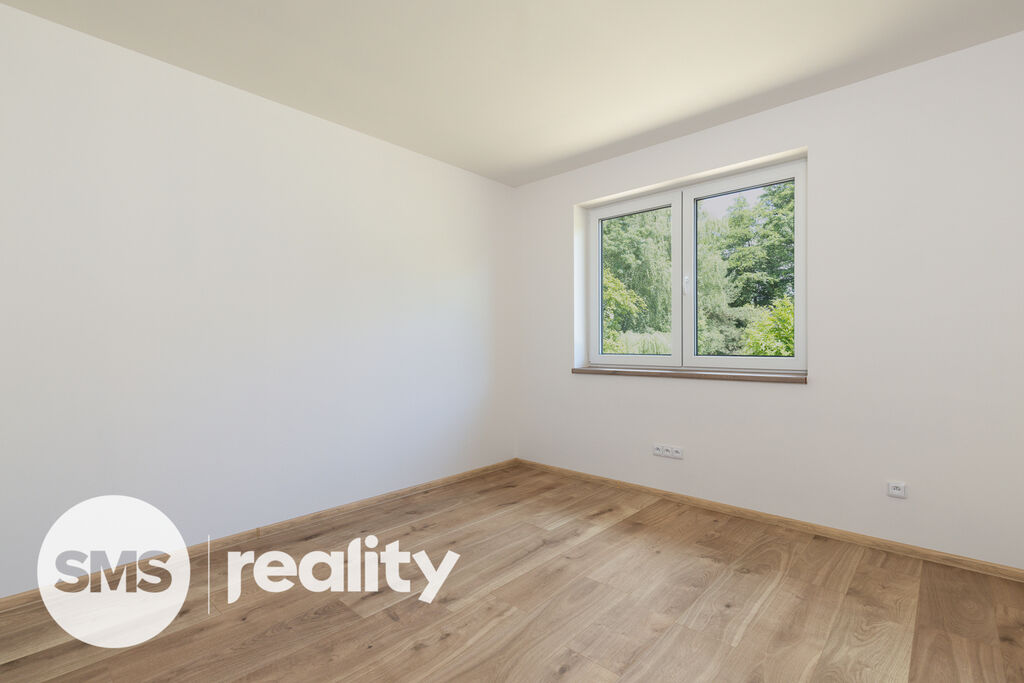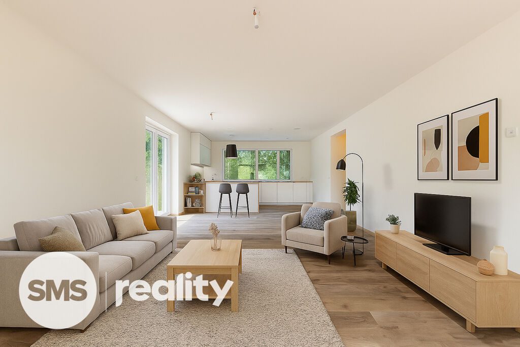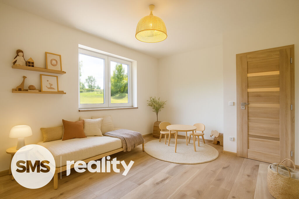 Jednopodlažní dřevostavba zaujme promyšlenou dispozicí a příjemnou atmosférou. Po vstupu vás přivítá prostorná veranda s místem pro vestavěnou skříň i botník. Na pravé straně se nachází světlý obývací pokoj propojený s kuchyní, tvořící srdce domu, odkud vede velkoformátový HS portál na slunnou terasu se zahradou. Na levé straně najdete čtyři samostatné pokoje, technickou místnost a elegantní koupelnu vybavenou vanou, sprchovým koutem i toaletou. Toaleta pro hosty je umístěna naproti verandě, což zaručuje soukromí ložnicové části.