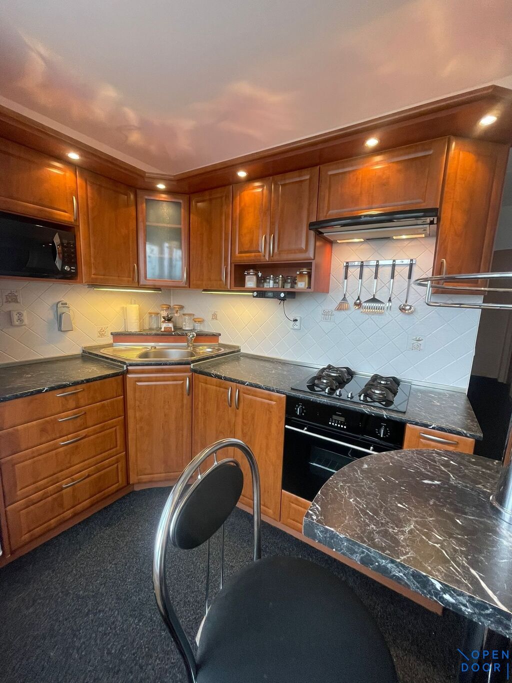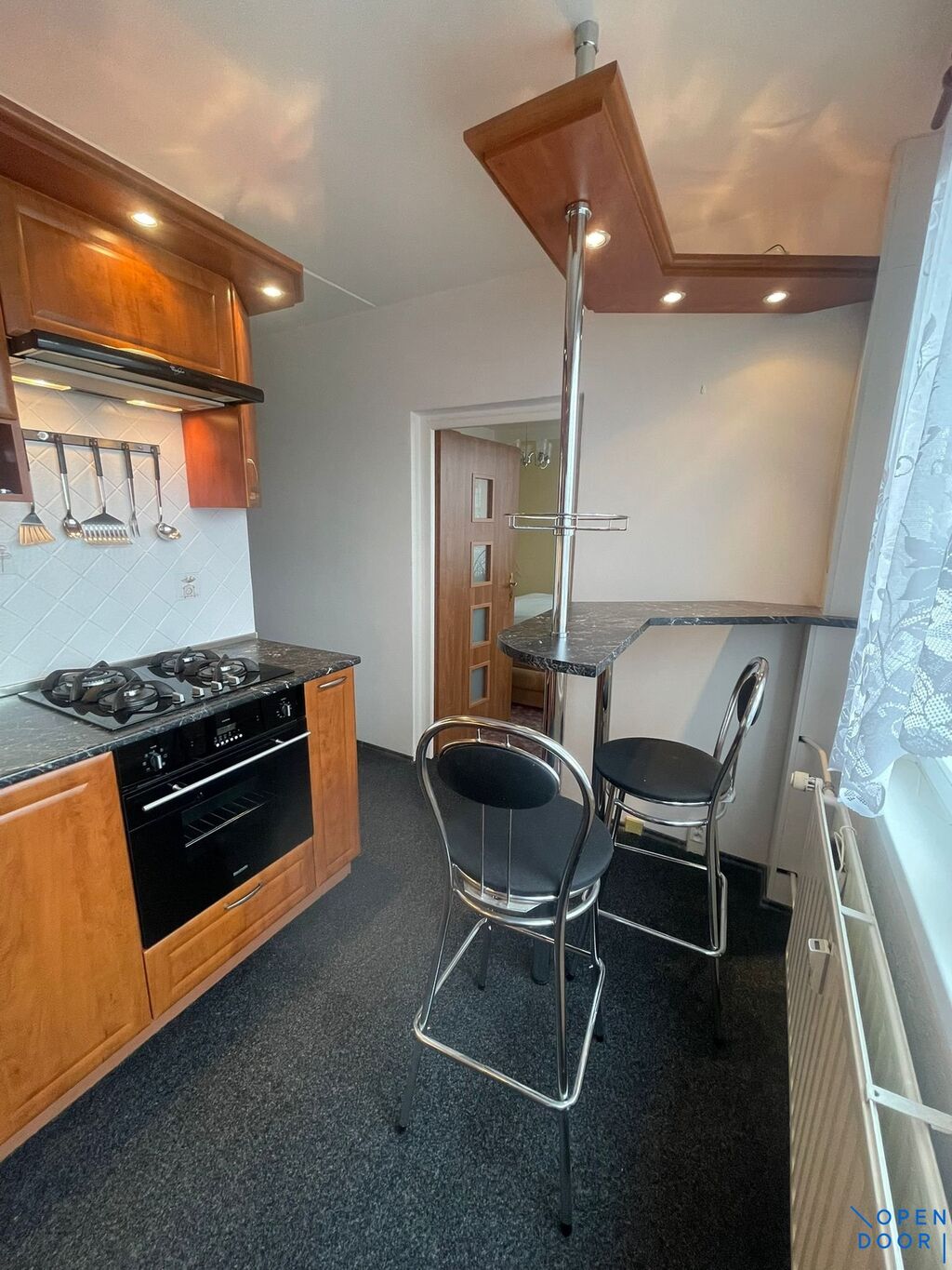 Byt se skládá ze vstupní chodby, obývacího pokoje s prostornou zasklenou lodžií, dvou samostatných pokojů a kuchyňské části s kuchyňskou linkou do tvaru „L“ vyrobenou na zakázku. Kuchyň je vybavena vestavnými spotřebiči – horkovzdušnou troubou a plynovou deskou BAUMATIC, výsuvnou digestoří WHIRLPOOL, mikrovlnnou troubou a lednicí.