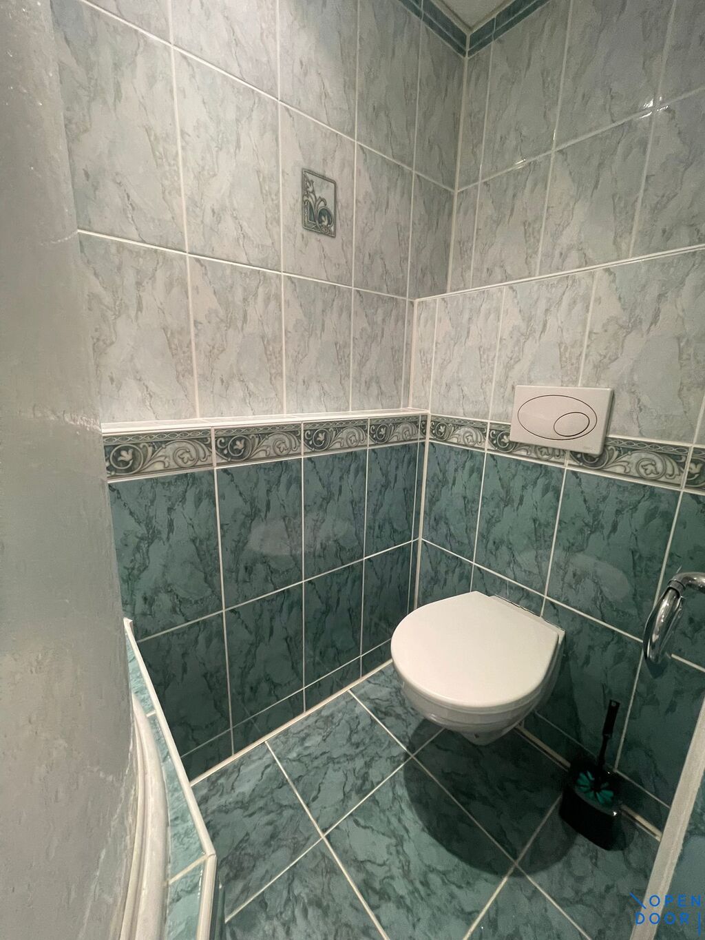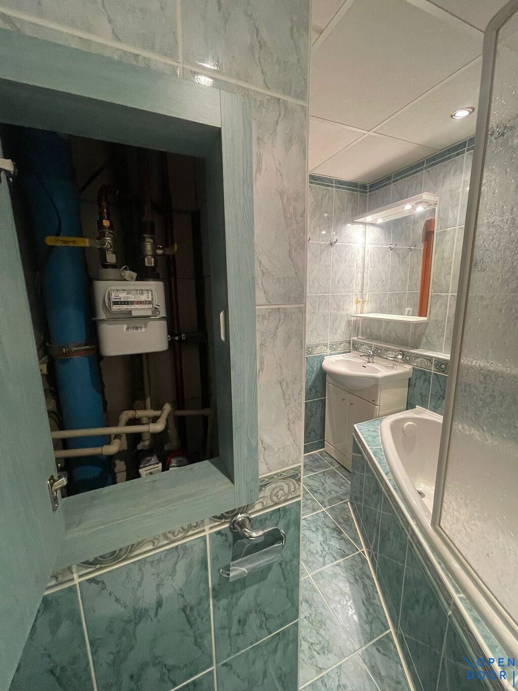 Koupelna je zděná a disponuje vanou se zástěnou, zrcadlem se skříňkou a pračkou, WC je samostatné. Posuvné dveře do koupelny jsou rovněž na míru.