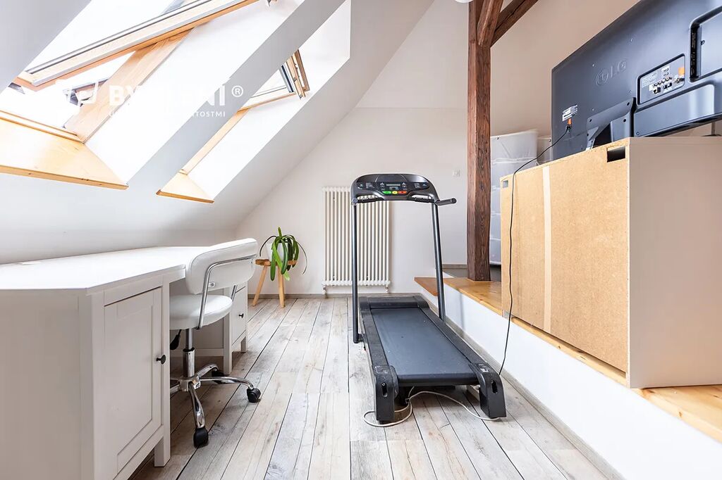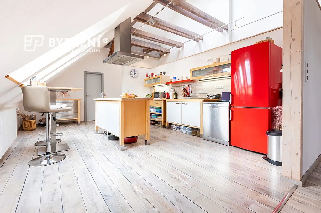 Interiér vás na první pohled zaujme otevřeným prostorem, vysokými stropy a dřevěnými prvky, které dodávají bytu jedinečný charakter. Dominantou obývací části je stylový krb, který vytváří příjemnou atmosféru a pocit domova i v chladnějších dnech.