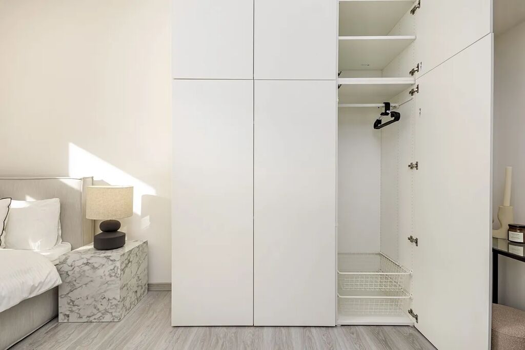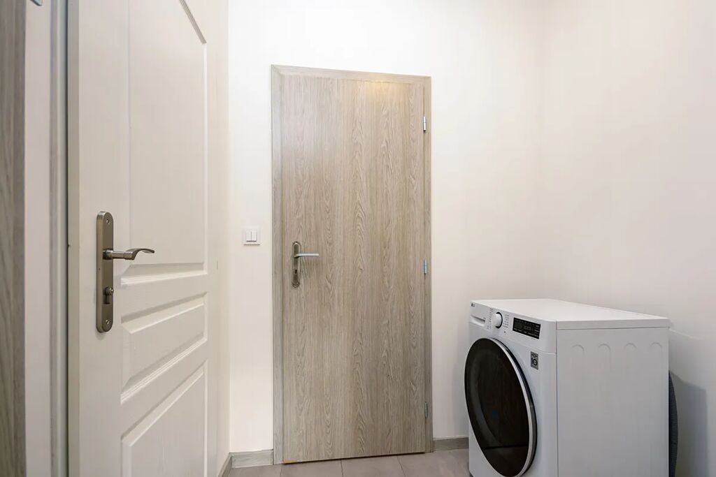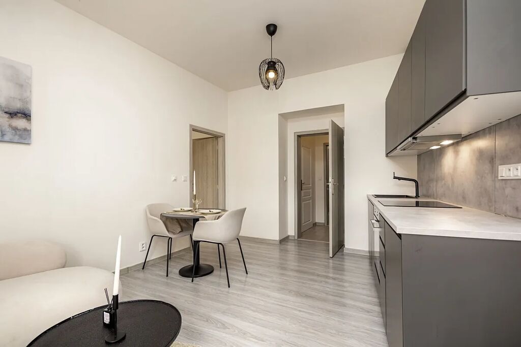 Po vstupu do bytu Vás přivítá prostorná chodba, ze které je vstup do koupelny se sprchovým koutem, toaletou a pračkou se sušičkou. Následuje obývací prostor s kuchyňským koutem, kde je moderní kuchyňská linka vybavená všemi spotřebiči – lednicí s mrazákem, myčkou, troubou, indukční varnou deskou a dalším vybavením.