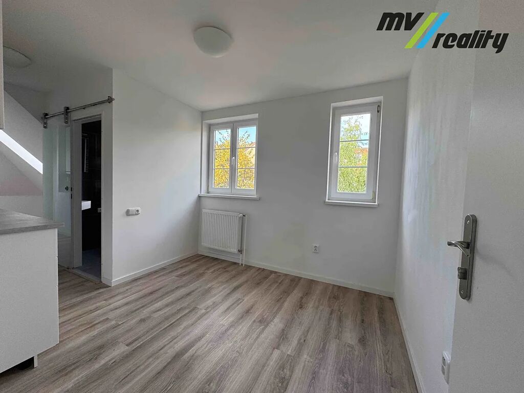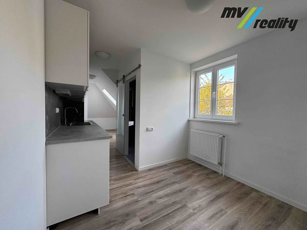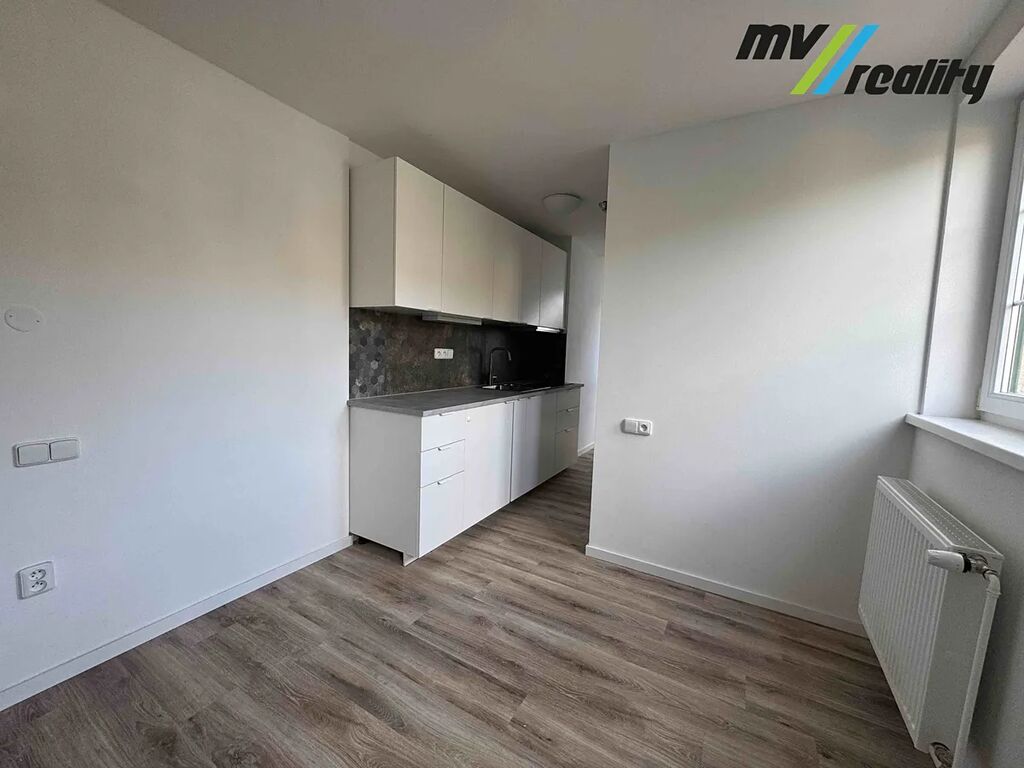 Obytný pokoj je prostorná a světlá místnost. Součástí bytu je nová kuchyňská linka v bílém designu s tmavou pracovní deskou. Okna zajišťují dostatek světla.