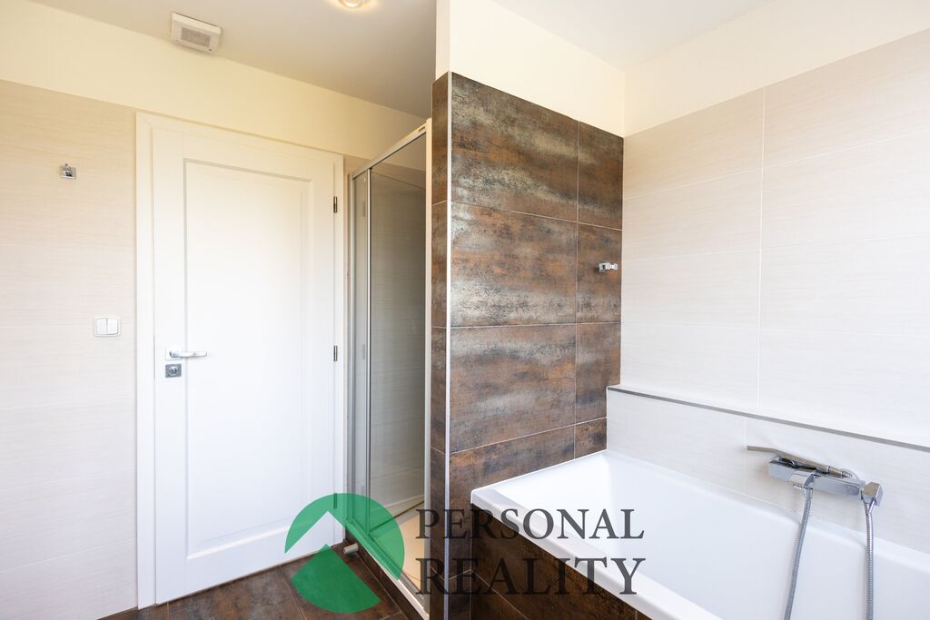 Horní patro: prosklená chodba, koupelna (WC, umyvadlo, vana a sprchový kout), dvě velké ložnice se šatnou, další samostatná místnost se vstupem na balkón a vstup na půdní prostor. Z oken horního patra je krásný výhled do okolí.
