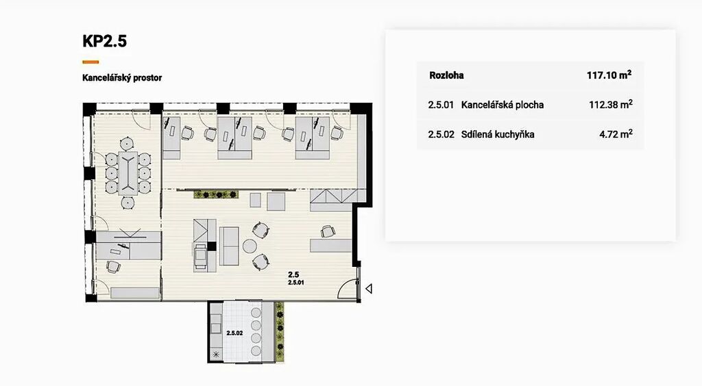 Nabízíme k pronájmu prostornou kancelář v novostavbě v aktivní části Prahy – Žižkov, jen několik minut od centra města. Celková plocha kanceláře je 117 m² s prostornou terasou, která nabízí ideální prostor pro setkání s klienty nebo relaxaci zaměstnanců na čerstvém vzduchu.