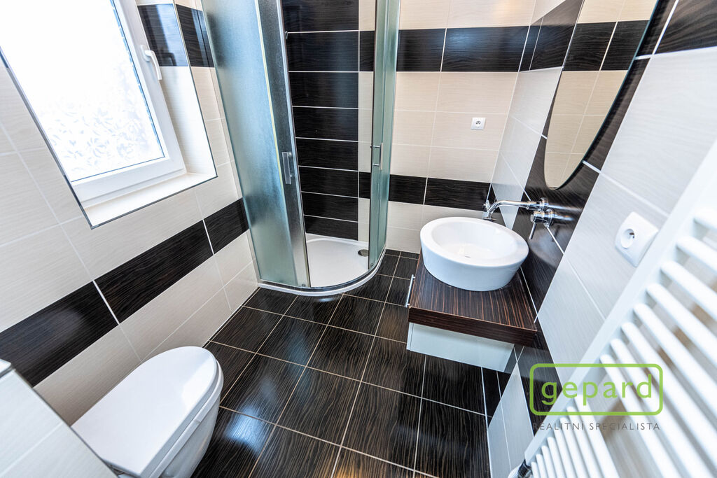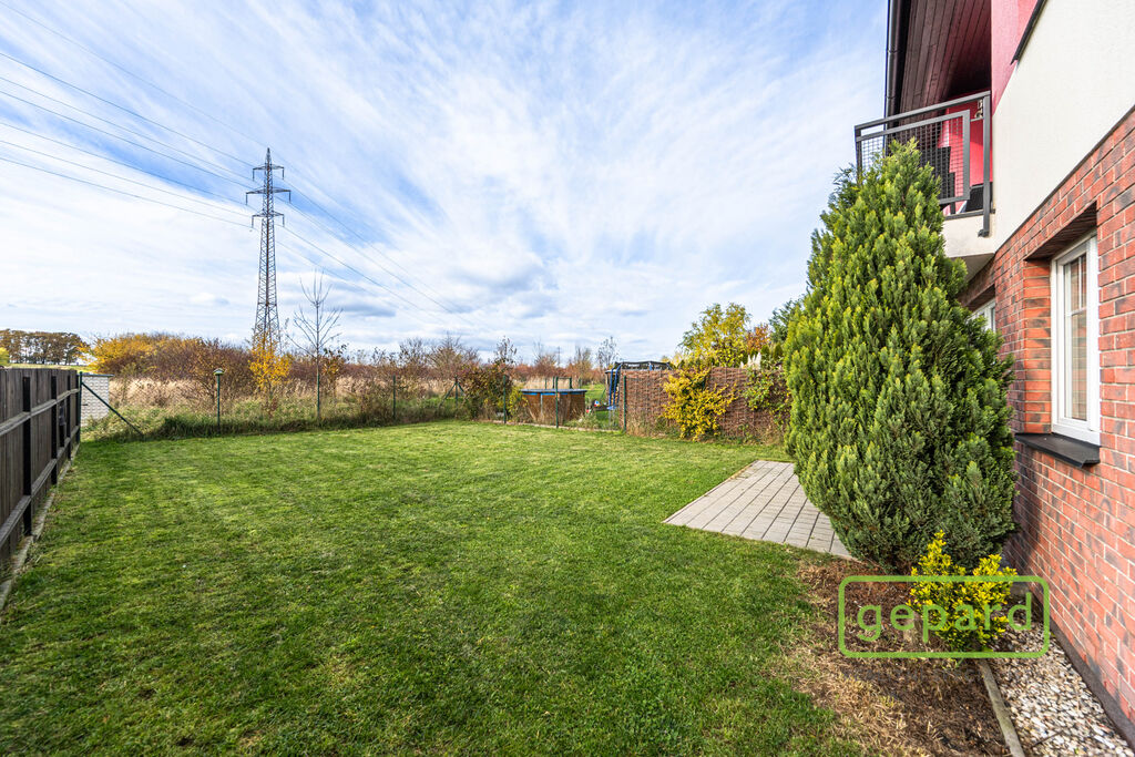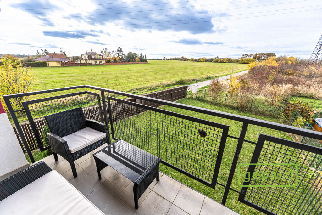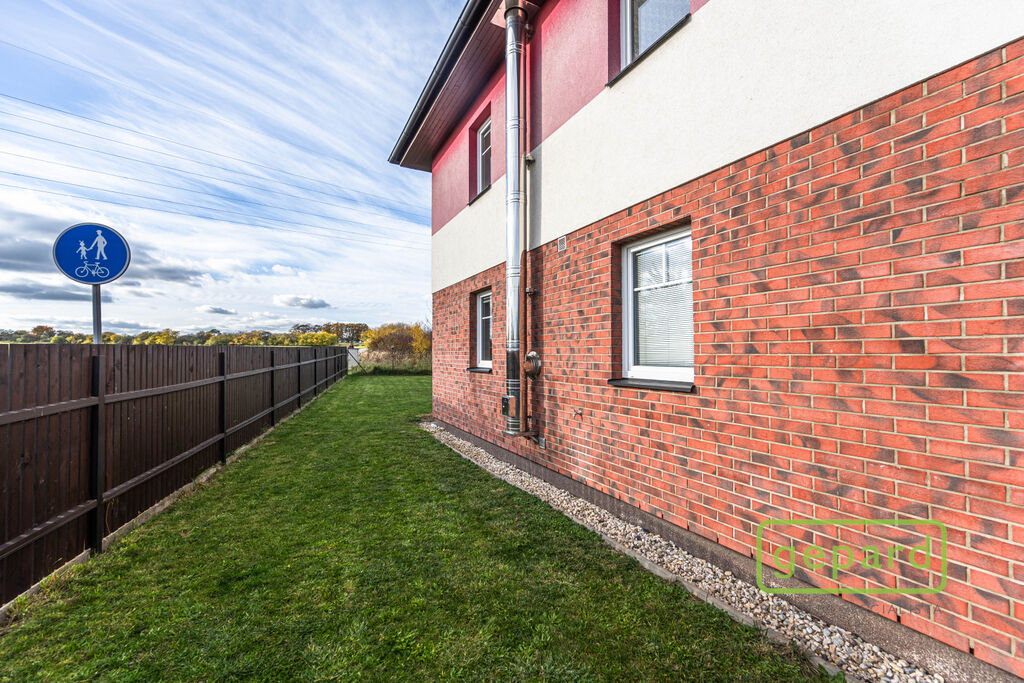 V přízemí je předsíň (6,61 m2), spíž (2,61 m2), koupelna se sprchovým koutem a WC (4,38 m2) a prostorný obývací pokoj s krbem a s přilehlou pracovnou (36,85 m2) + kuchyňský kout (6,44 m2). Kuchyně je vybavená kuchyňskou linkou včetně spotřebičů (velká americká lednice, horkovzdušná trouba, indukční varná deska, myčka, digestoř). Z obývacího pokoje je přímý vstup na terasu a do zahrady. V prvním patře je chodba (4,95 m2), koupelna s vanou a WC (8,06 m2) a 3 ložnice (11,23, 12,68 a 30,46 m2) Dvě z ložnic mají přístup na balkon. Dům je pronajímán bez dalšího vybavení. Vytápění a ohřev vody zajišťuje plynový kondenzační kotel, pro navození příjemné atmosféry nebo snížení nákladů na topení lze využít krb.