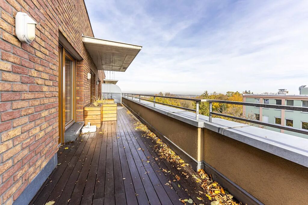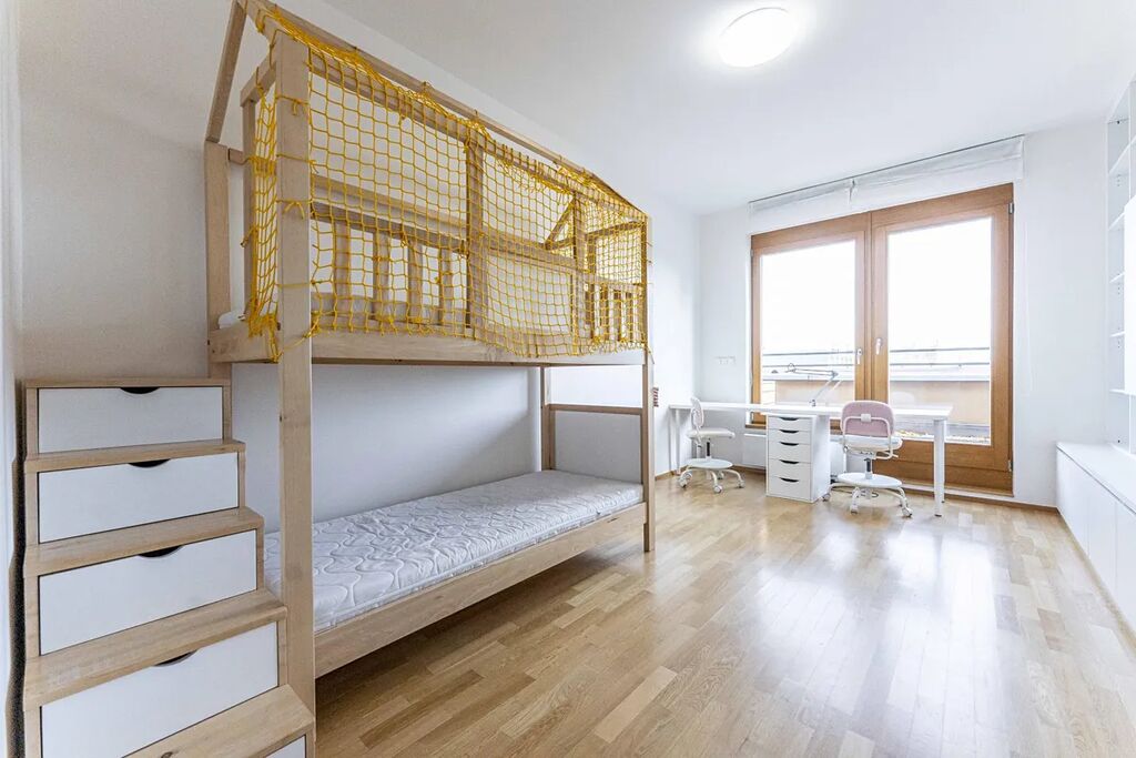 Byt cca 153 m2 má vstupní chodbu, velký obývací pokoj propojený s kuchyní (vybavená běžnými spotřebiči) a vstupy na velkou střešní terasu, která obklopuje celý byt. 3 ložnice, 2 koupelny, extra toaleta, komora. Vybavení odpovídá fotografiím. V bytě je dostatek vestavných skříní. Dřevěné podlahy, dlažba, centrální vytápění. K bytu náleží dvě parkovací stání a velký sklep (cca 11,5 m2) v suterénu domu.
