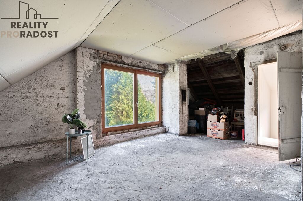 V patře jsou 2 pokoje k dokončení. Jeden s velkou terasou, kde je třeba položit podlahu a je téměř hotovo. Ve druhém pokoji je toho k dokončení více. V malá místnosti v patře je pak ideálním místem ke zbudovaní koupelny s WC.