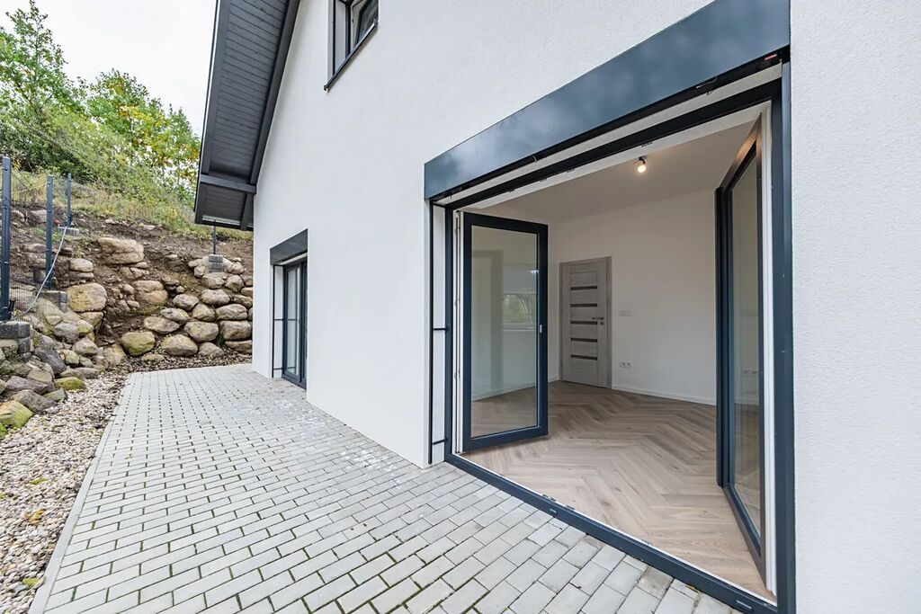 V přízemí najdete dvě ložnice, pracovnu (či pokoj pro hosty), koupelnu s walk-in sprchou a samostatnou toaletu. Z každého pokoje je vstup na terasu obklopující dům. V patře vás čekají další dvě prostorné místnosti se šikminami – ideální pro dětské pokoje, hernu, ateliér nebo šatnu snů.