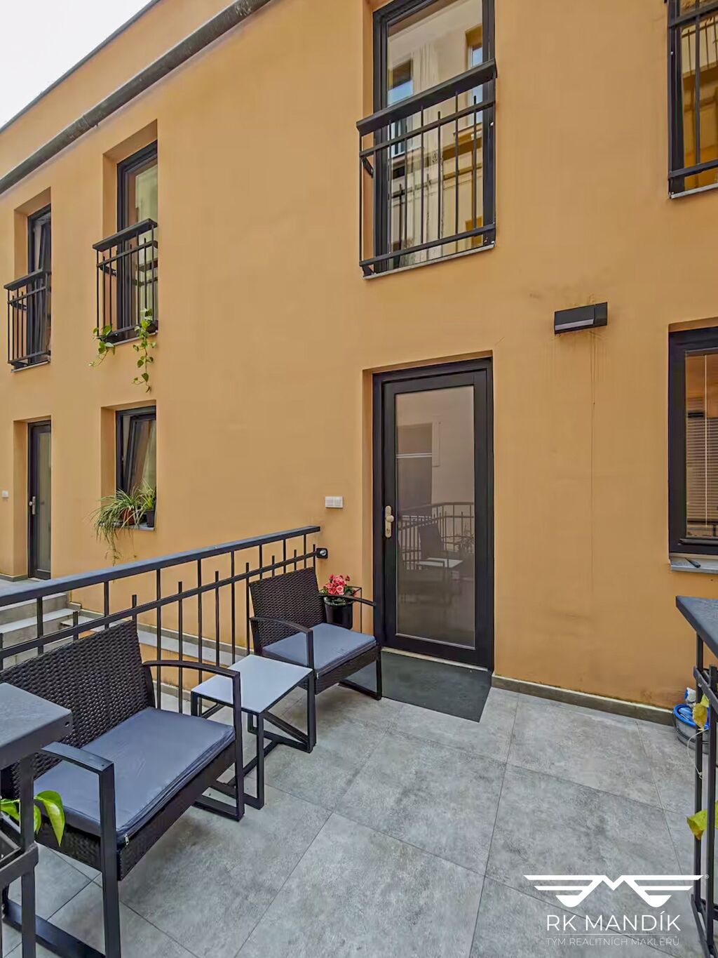Součástí pronájmu je i možnost využívání přední terasy (6 m²), umístěné ve vstupní části objektu, která poskytuje příjemné posezení a prostor pro odpočinek. Kuchyňská linka na míru je vybavena vestavnými spotřebiči – varnou deskou, elektrickou troubou, digestoří a lednicí. Celý interiér je kompletně zařízen nábytkem v moderním, minimalistickém stylu a doplněn kvalitními zařizovacími prvky.