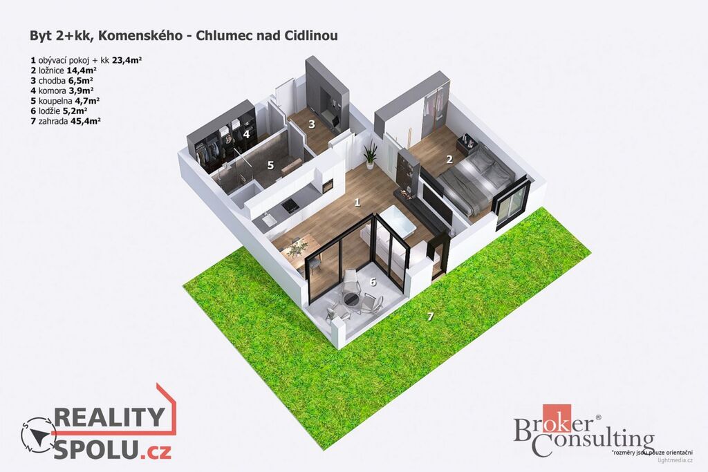 Byt se nachází v přízemí a jeho velkou výhodou je soukromá zahrada o rozloze 45 m², do které je přímý vstup z obývacího pokoje nebo přes venkovní branku. K dispozici je také praktická komora (3.9 m²), která poskytne dostatek úložného prostoru.
