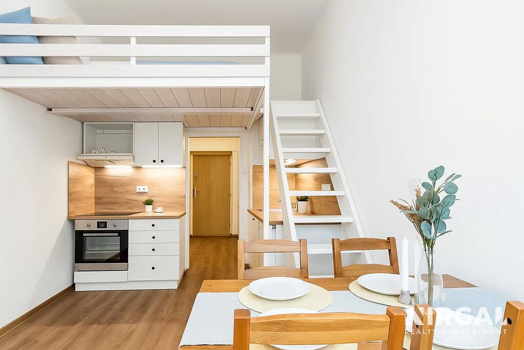 Interiér tvoří obývací pokoj s kuchyňským koutem (plně vybavená kuchyňská linka, lednička, vestavěné skříně), ložnice s útulným vestavěným patrem o ploše 4 m², koupelna se sprchovým koutem a WC. Díky vysokým stropům a chytrému řešení působí byt vzdušně a elegantně.
