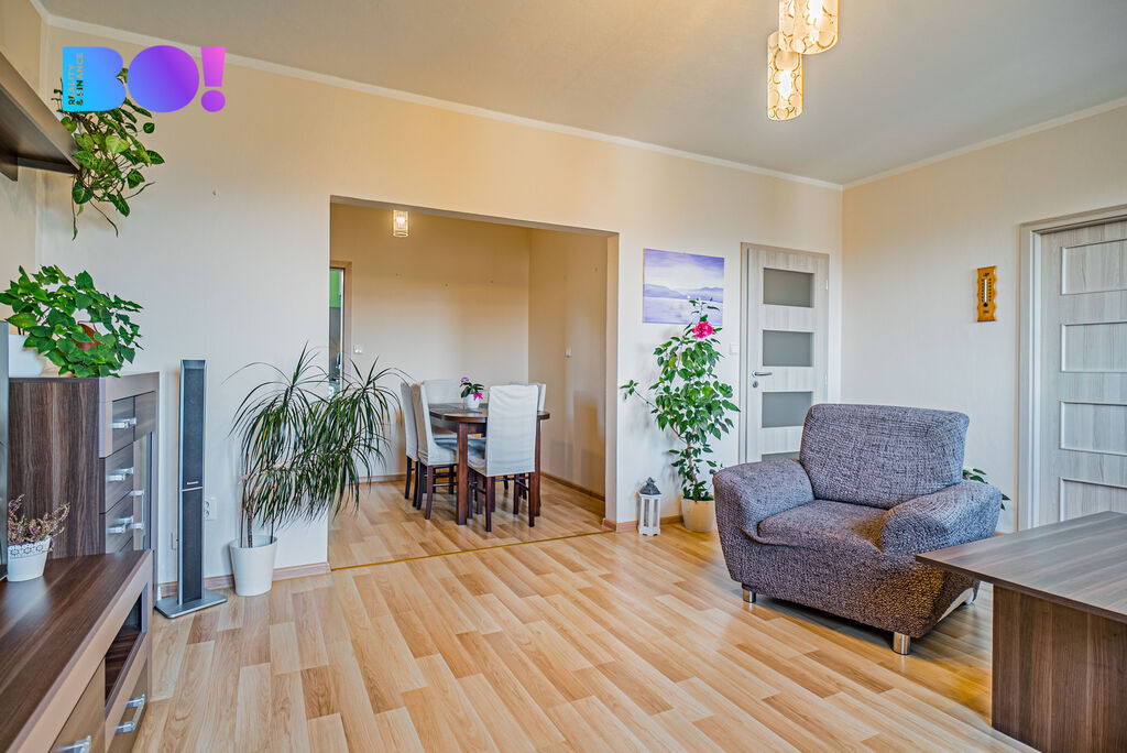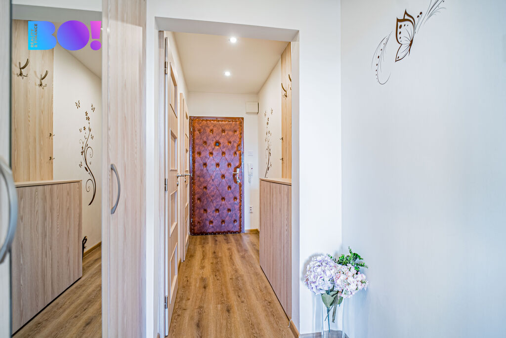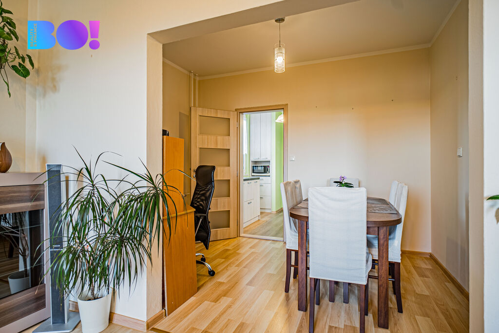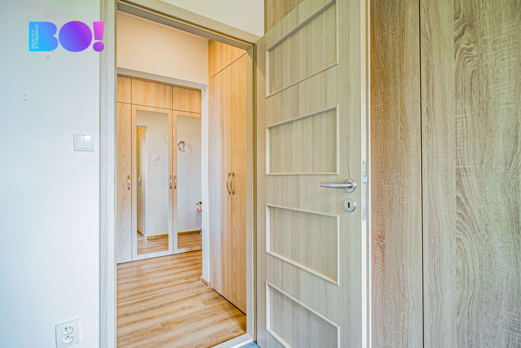 Dostatek úložného prostoru spolu s jídelním koutem dělá z bytu ideální domov pro rodinu, která hledá funkční a útulné zázemí.