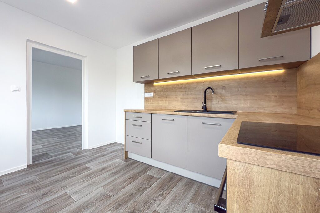 Nová kuchyňská linka na míru, nové podlahy a dveře, kompletně nová elektroinstalace, elegantní koupelna, samostatné WC s místem pro pračku či sušičku. Každý detail byl dělaný tak, aby se tu bydlelo pohodlně a bez kompromisů.