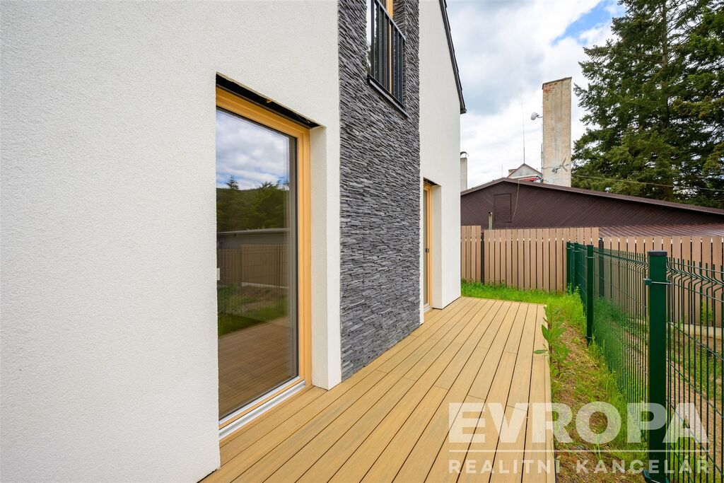 Spodní byt (55 m2) má krásnou terasu s předzahrádkou. Z horního bytu (62 m2) je krásný výhled na bazén, který je umístěn přímo před domem.