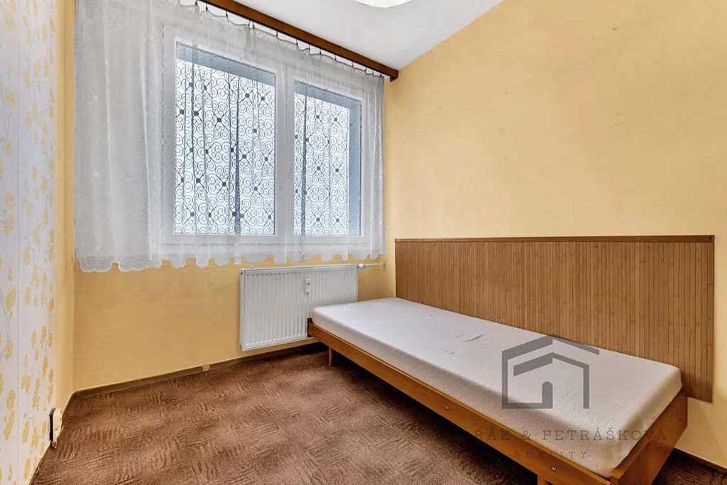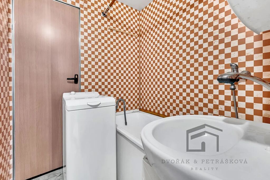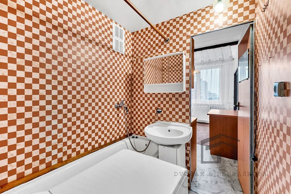 Koupelna s vanou je v původním stavu s umakartovým jádrem a toaleta je umístěna samostatně. Rozvody elektřiny jsou původní, tedy v hliníku. Byt je vhodný k celkové rekonstrukci. Nábytek v nemovitosti můžeme ponechat či odvést, obojí v rámci kupní ceny. V bytě je plyn a elektřina. Teplou vodu a ohřev TUV zajišťuje dálkový rozvod z teplárny. K bytu náleží komora na patře (2 m2) a sklep (2 m2) v prvním podzemním patře.