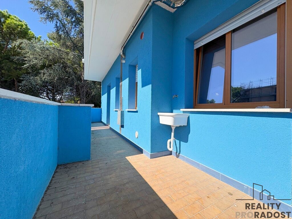 Byt nabízí dobře uspořádané prostory — vstupní část vede do útulného obývacího pokoje s přímým vstupem na prostornou terasu, která obchází byt po obvodu. Jedná se o perfektní místo pro chvíle relaxu, letní stolování i večerní posezení s mořským vzduchem. Kuchyňský kout má vlastní okno, díky kterému je prostor světlý a vzdušný. V noční zóně se nachází ložnice s manželskou postelí, druhá ložnice a koupelna s vanou.
