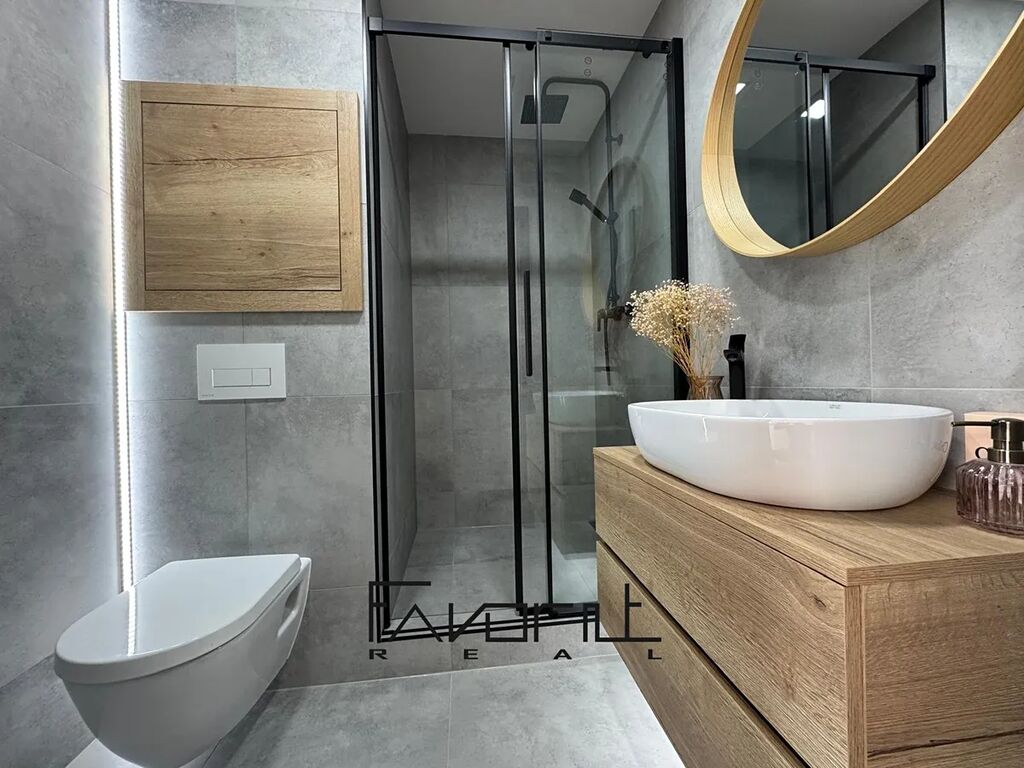 • Zcela nová koupelna s moderními obklady, sprchovým koutem, umyvadlem se skříňkou, bateriemi a zrcadlem