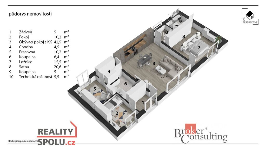 - prostorný obývací pokoj s kuchyňským koutem (42,5 m²) a vstupem do technické místnosti