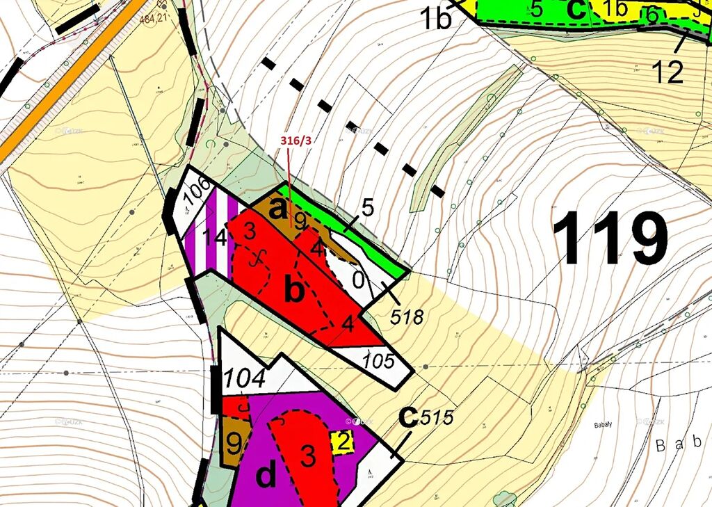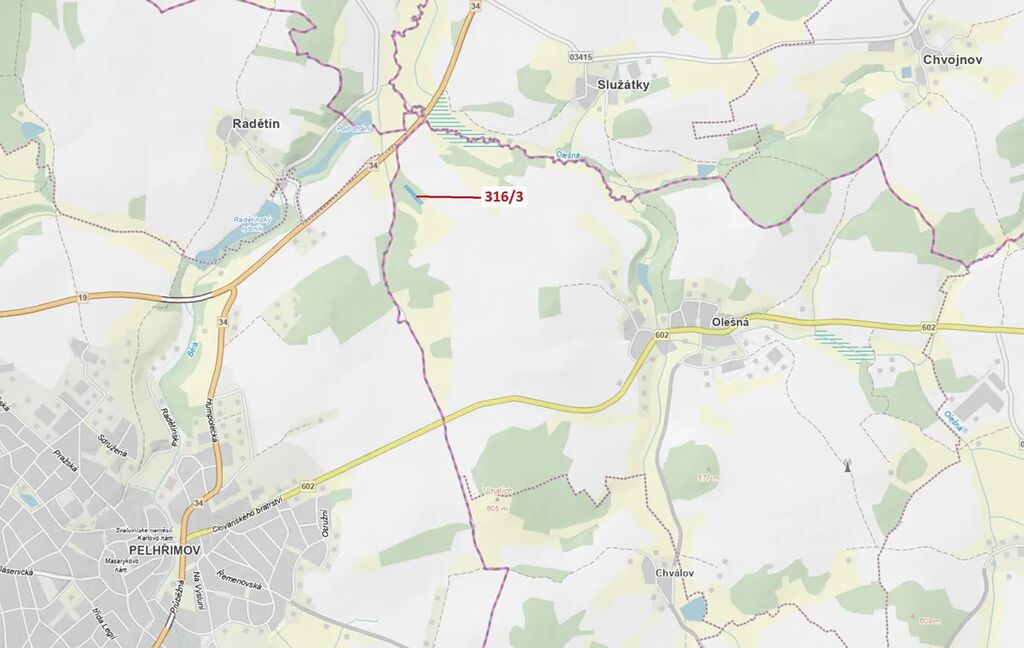 Lesní pozemek o výměře 2554 m2, parcelní číslo 316/3, podíl 1/1, katastrální území Olešná u Pelhřimova, obec Olešná, obec s rozšířenou působností Pelhřimov, okres Pelhřimov, Kraj Vysočina. Po těžbě.