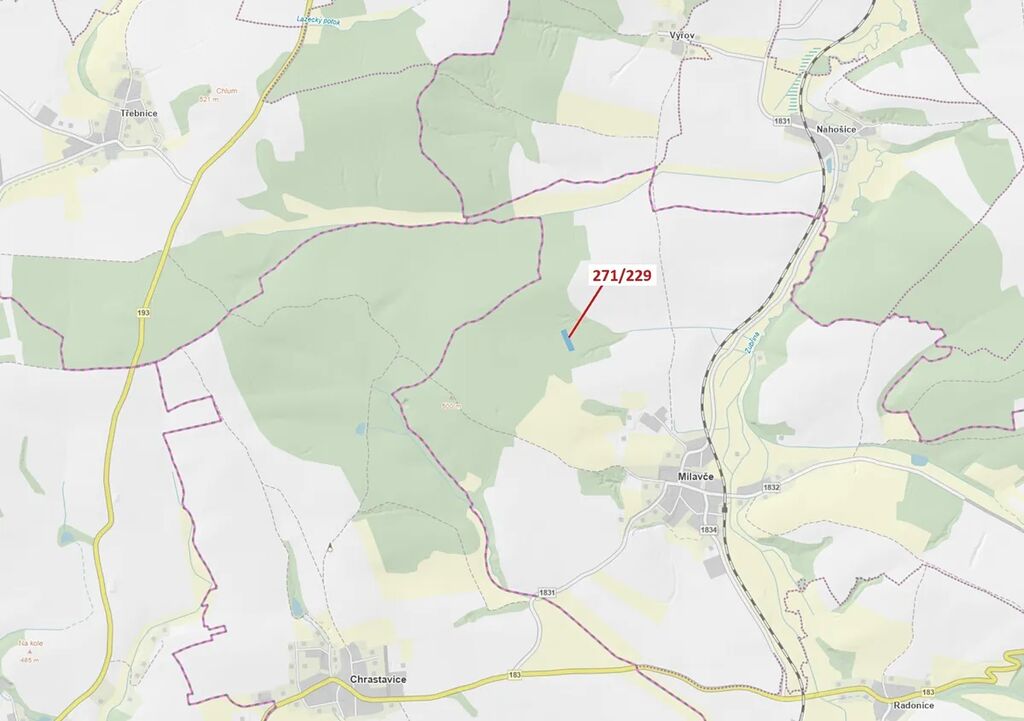 Lesní pozemek o výměře 3695 m2, parcelní číslo 271/229, podíl 1/1, katastrální území Milavče, obec Milavče, obec s rozšířenou působností Domažlice, okres Domažlice, Plzeňský kraj. Částečně po těžbě.