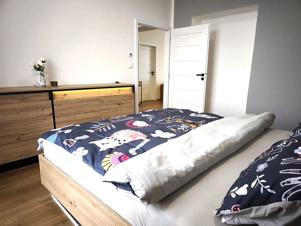 Byt je ve 3.patře bez výtahu a sestává z prostorné chodby, ze které je přístup do komory (pračka a sušička), koupelny (s vanou, sprchovým koutem a umyvadlem), samostatného WC, ložnice s balkonkem a prostorného obývacího pokoje, jídelny a kuchyňského koutu. Dále pak ještě druhá ložnice. Všechny místnosti jsou velmi prostorné a světlé. Vinylová podlaha s dekorem dřeva a podlahové vytápění v celém bytě ještě více navozuje pocit útulného bydlení.