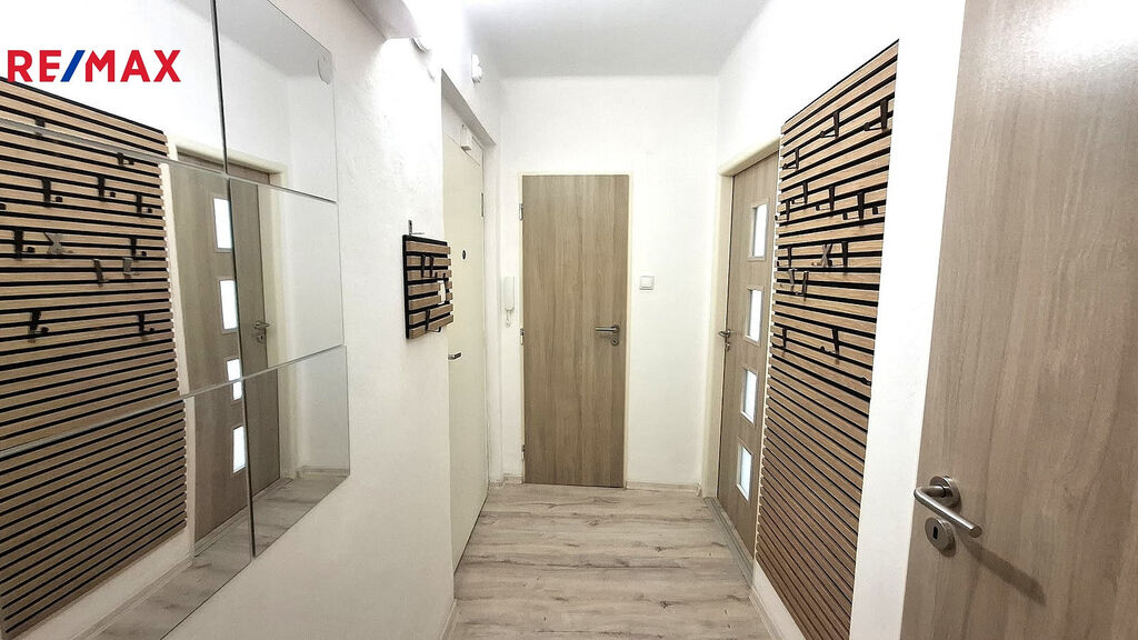 Interiér bytu nabízí světlé a vzdušné prostory, které vás okouzlí svou útulností. Kuchyně je vybavena kuchyňskou linkou s myčkou, plynovou varnou deskou a elektrickou troubou, lednicí a stolem s židlemi. V obývacím pokoji se nachází obývací stěna s konferenčním stolem, která tam však nemusí zůstat. Samostatná ložnice je nezařízena. Byt se dále pyšní pěknou velkou koupelnou se sprchovacím koutem, umyvadlem, policemi a pračkou. V předsíni jsou praktické háčky na odkládání svršků. U předsíně je samostatná malá komora.