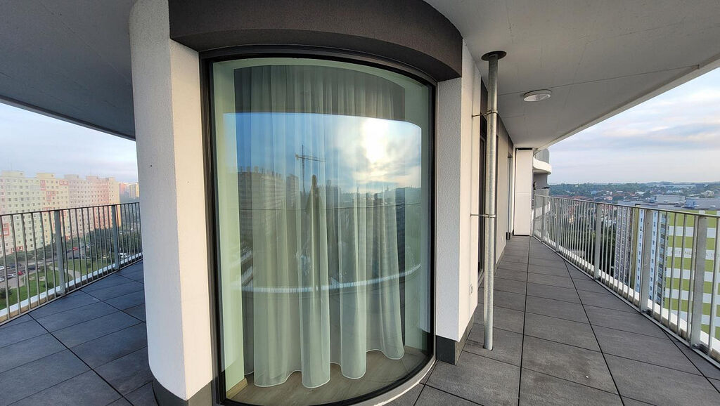 Velmi pěkný, prostorný a slunný byt č.1207 o dispozici 3+kk s obloukovou terasou a výhledem ze 12.patra moderní budovy. Byt nabízí mimo jiné dvě koupelny se sprchou i vanou. V obou koupelnách Vás jistě potěší příjemné podlahové vytápění.