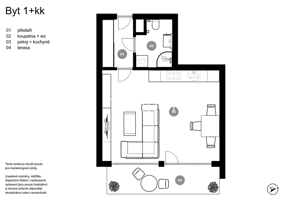 Byt tvoří rozlehlý obytný pokoj s kuchyňským koutem, vstupní chodba a koupelna se sprchovým koutem. Z obývací části je vstup na prostornou terasu orientovaný do klidné části projektu.