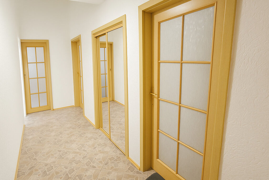 Interiér je částečně zařízený, součástí je kuchyňská linka, úložné prostory a vestavěné skříně. K bytu náleží také sklep o velikosti 3,36 m² a přístup do společných prostor domu.