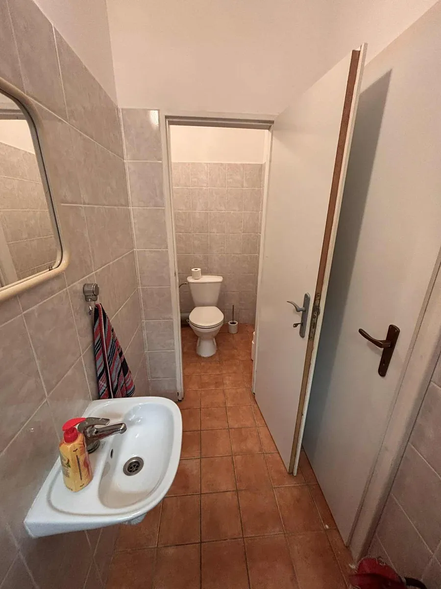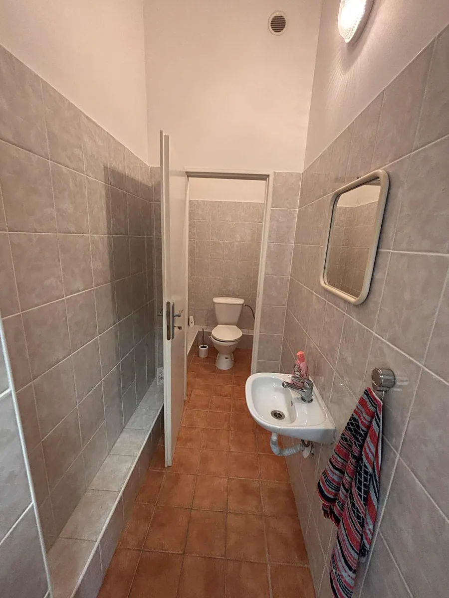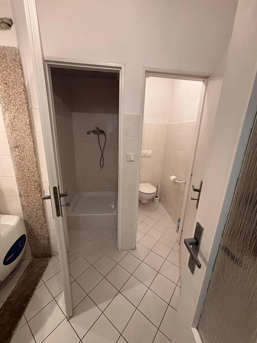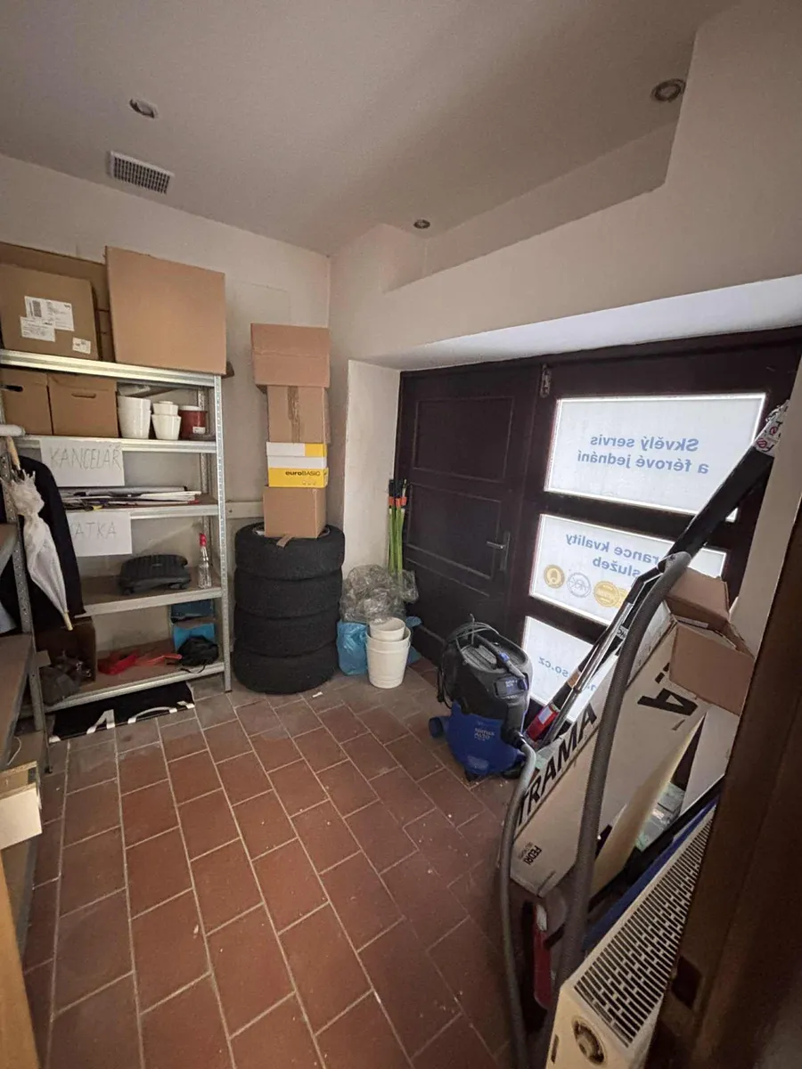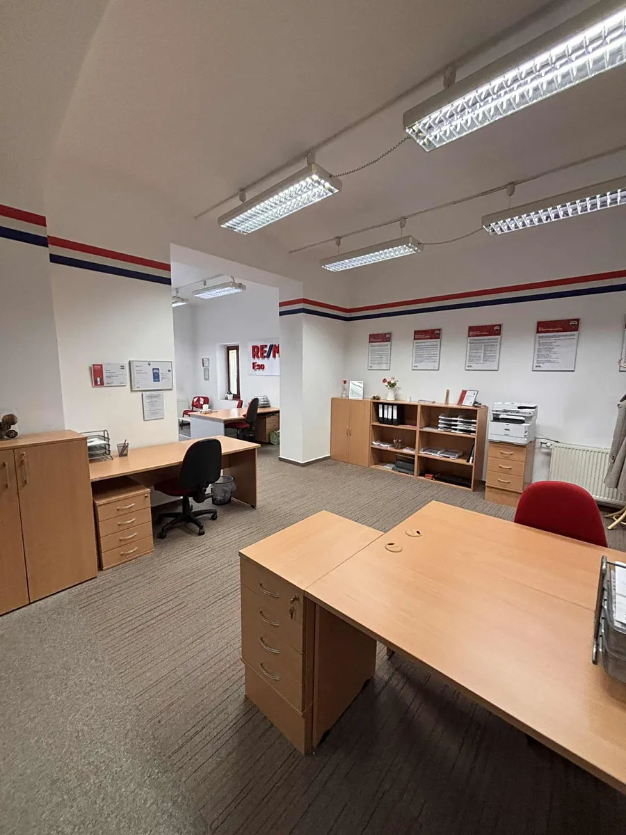 Celý prostor je rozdělen na 4 místnosti , sklad přístupný z parkoviště, dále je zde kuchyňský kout, úklidová komora, sprchový kout, 3x WC. 2x WC v předním prostoru, jedno WC a sprcha v zadní části. Vytápění celého prostoru je kombinovaným plynovým kotlem.