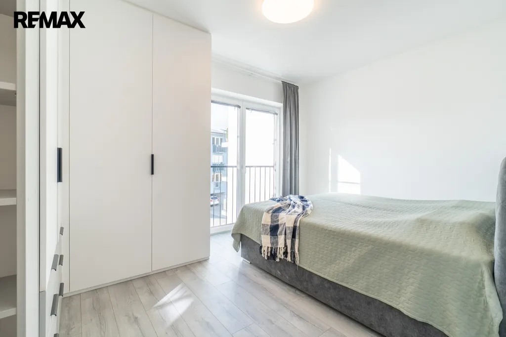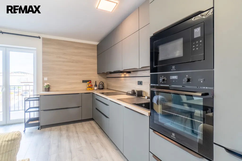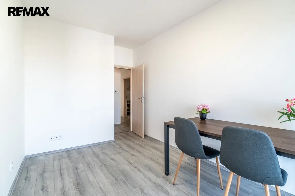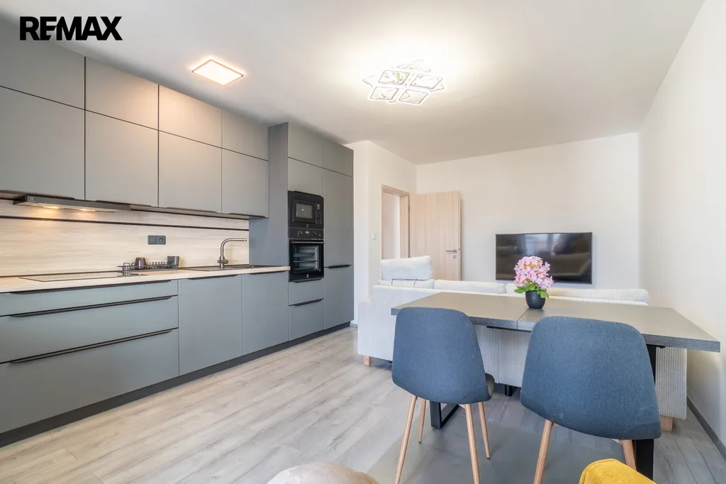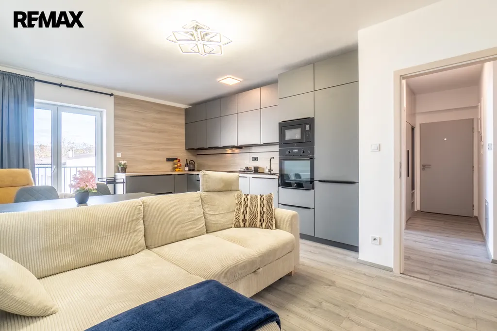 V obývacím pokoji s kuchyňským koutem je vstup na prostorný balkon, ideální pro ranní kávu. Obývací část je zařízena rozkládací sedačkou a jídelním stolem se židlemi. Kuchyňská linka je vybavena vestavěnými spotřebiči: varná deska, myčka, lednice, trouba, mikrovlnná trouba a digestoř. Na stejné straně se nachází dětský pokoj či pracovna s flexibilním využitím, vybavená pracovním stolem. Dále je k dispozici ložnice s manželskou postelí a vestavěnou skříní.