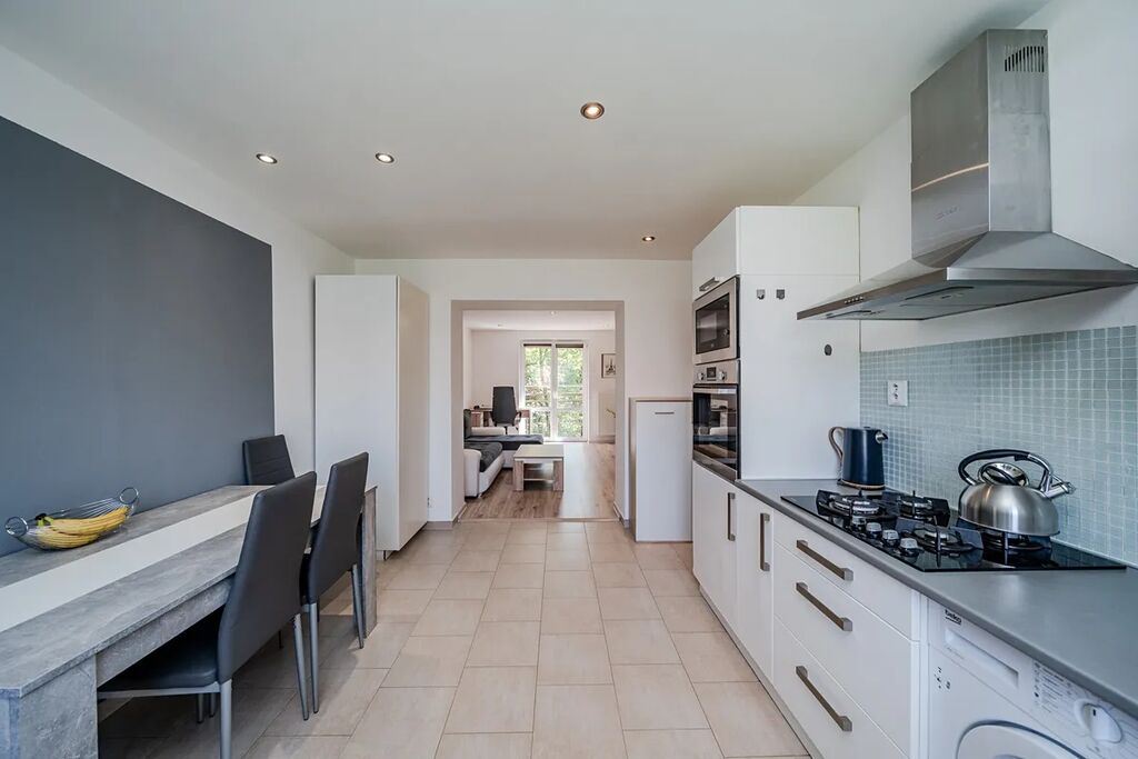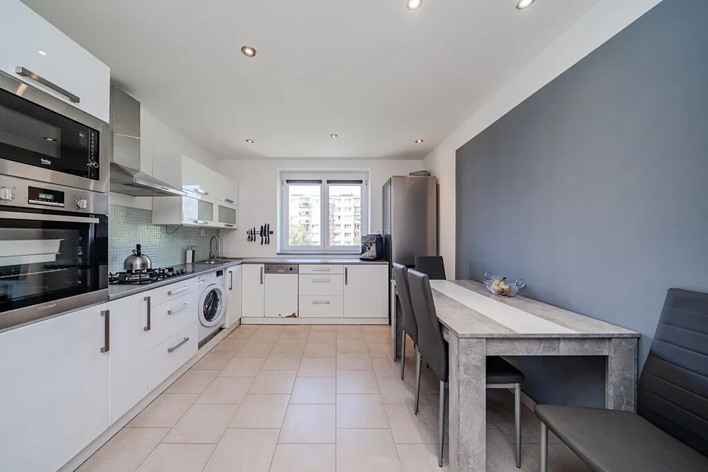 Byt je po celkové rekonstrukci (cca 10 let) a nabízí moderní a pohodlné bydlení. V kuchyni (14,3 m²) je dlažba s podlahovým vytápěním, rohová kuchyňská linka včetně spotřebičů – lednice s mrazákem, myčka, horkovzdušná trouba, mikrovlnná trouba, plynová varná deska, digestoř a pračka. K dispozici je také jídelní stůl a 4 židle.