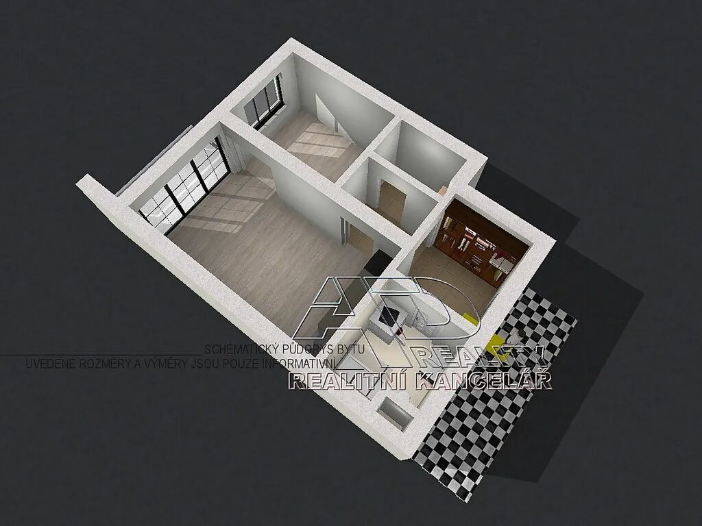 Dispozice: obytná místnost spojená s kuchyňským koutem [20.2m2], ložnice (9.6m2), prostorná předsíň [8.85m2] s komorou (šatna) [3.3m2], koupelna s WC [5.1m2].