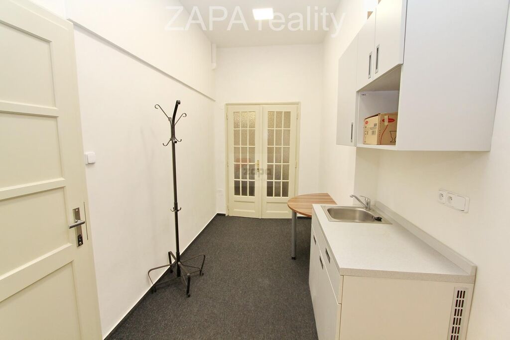 Obě kanceláře jsou velmi vzdušné a světlé, s vysokými stropy 3,7m, vlastní kuchyňkou a sociálním zařízením (sprchový kout, WC). Jsou částečně zařízené, dle dohody je možné nábytek vystěhovat. Oválná kancelář je průchozí do zadní kanceláře viz plánek.