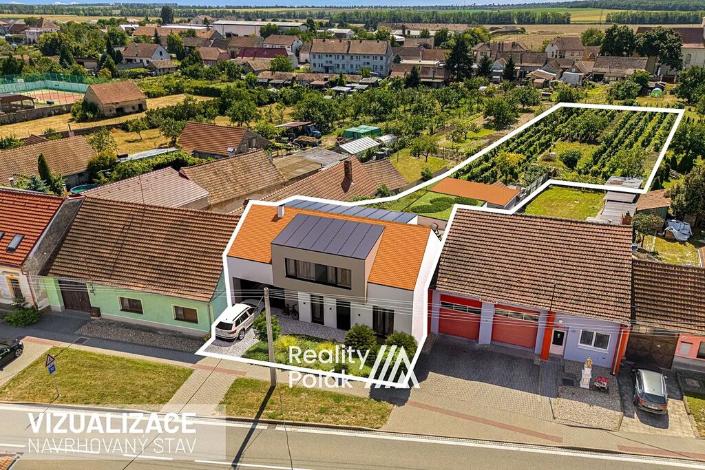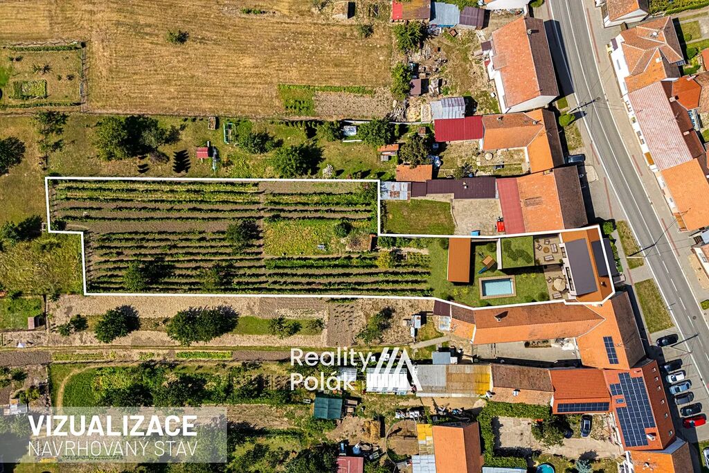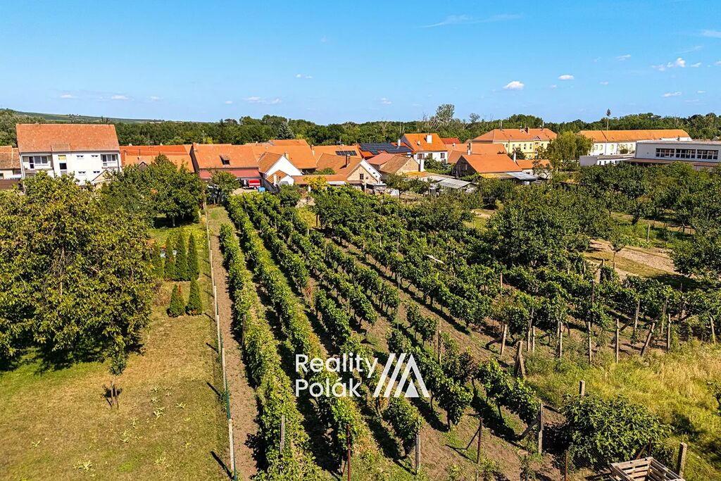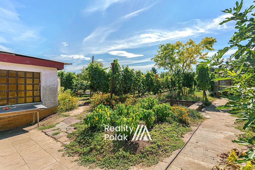 Za domem se rozprostírá velká zahrada osázená 570 hlavami vinné révy, vzrostlými meruňkami a několika keři smokvoní. Součástí zahrady je také vstup do prostorného vinného sklepa o ploše 35 m² + vstupní chodba /schodiště 8 m².
